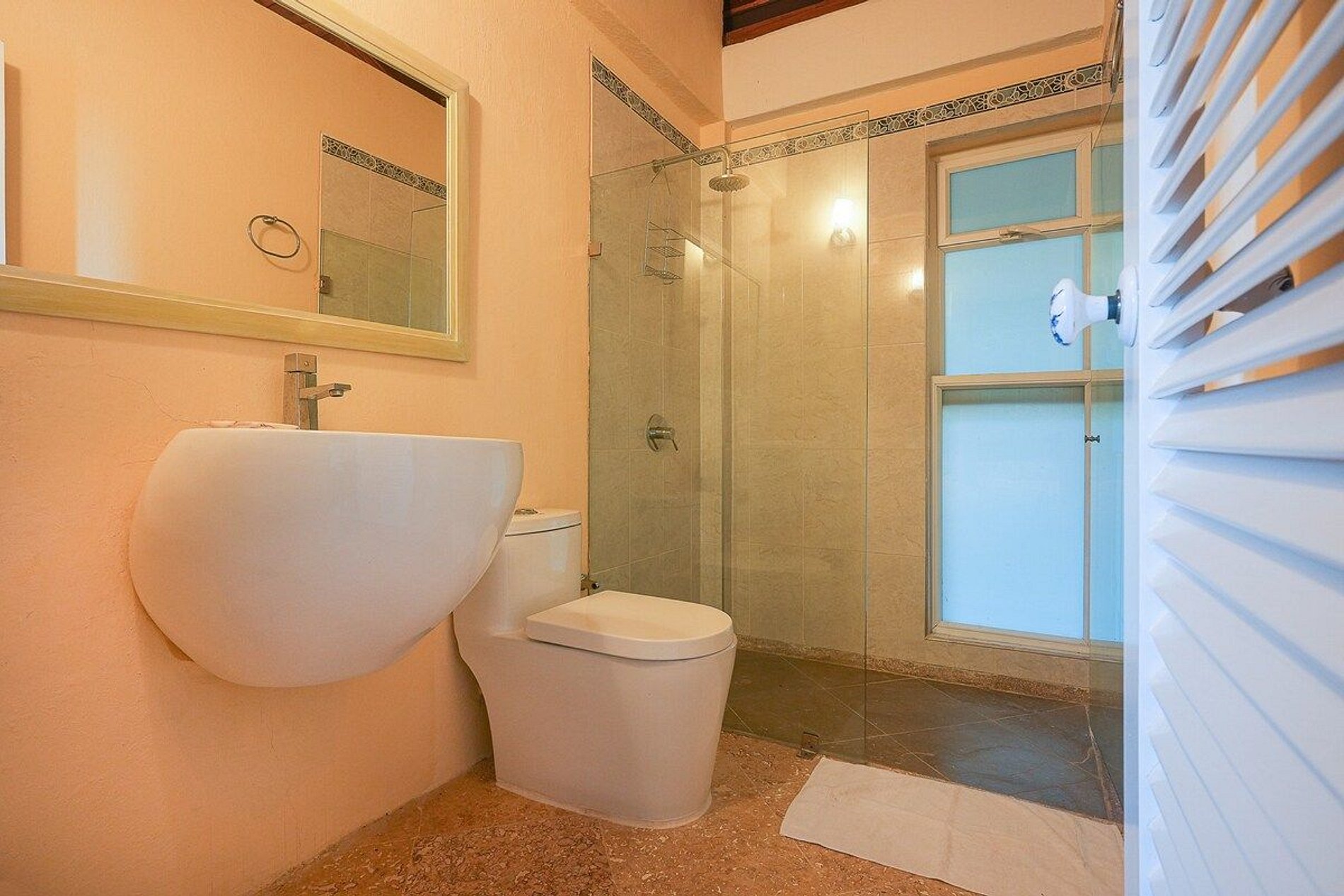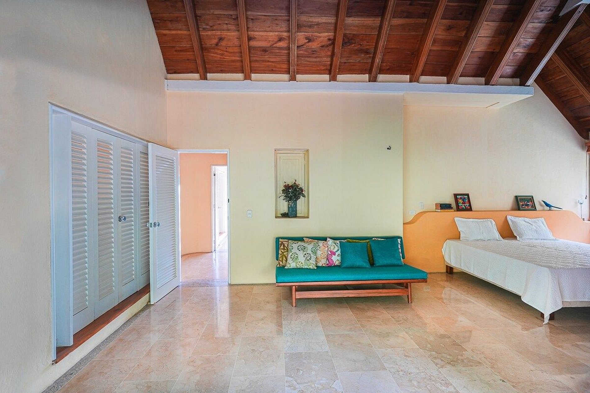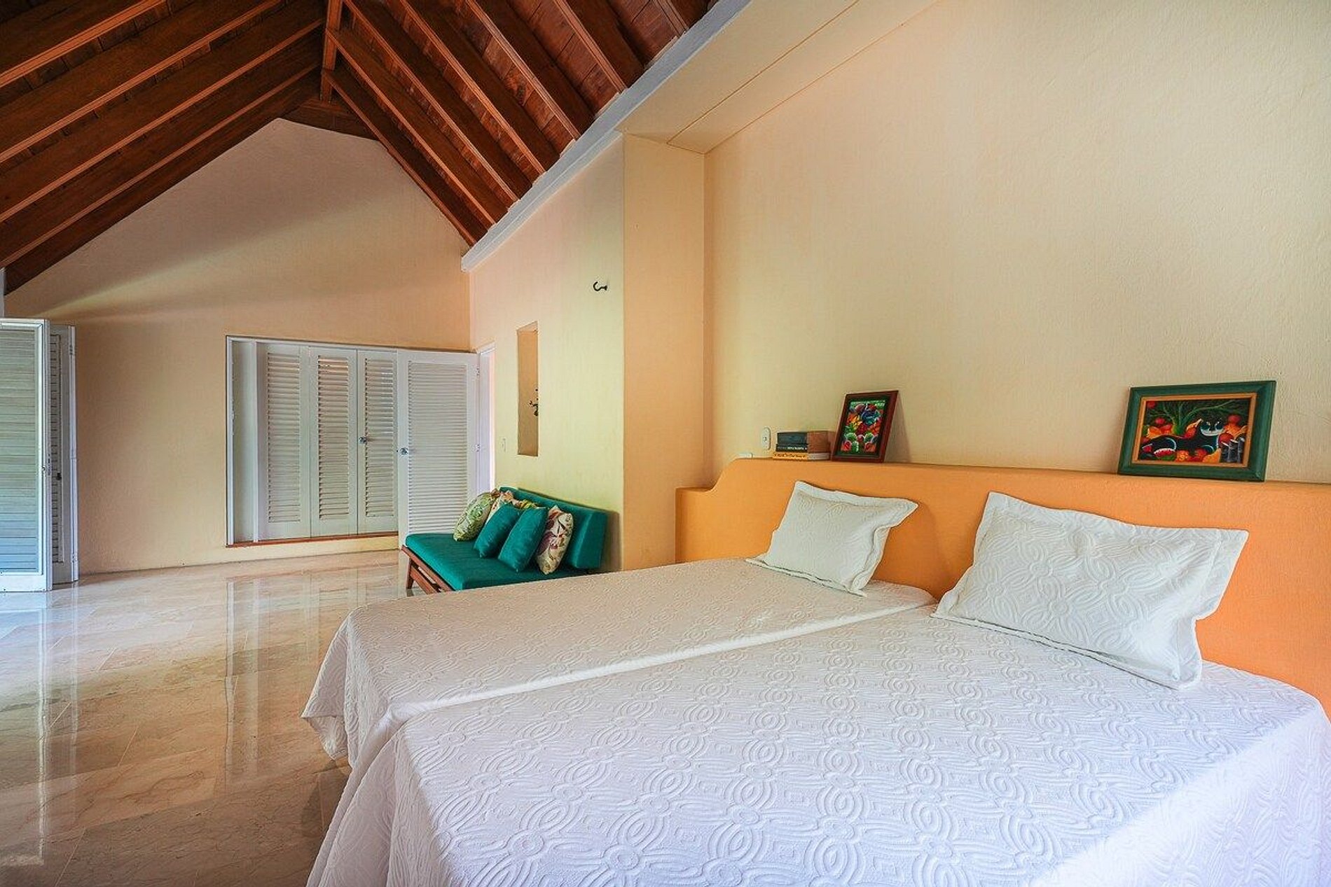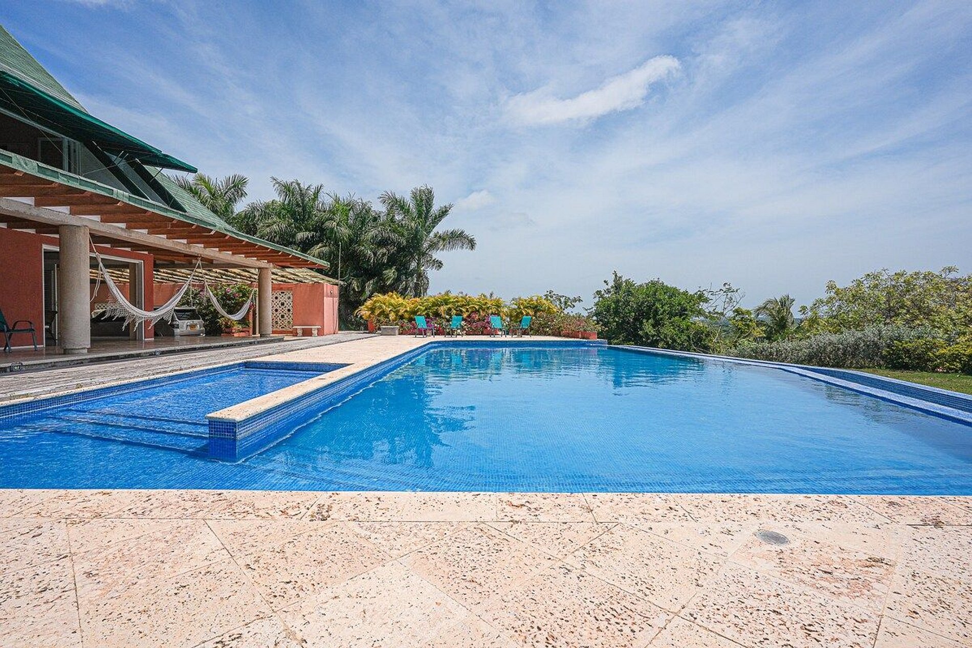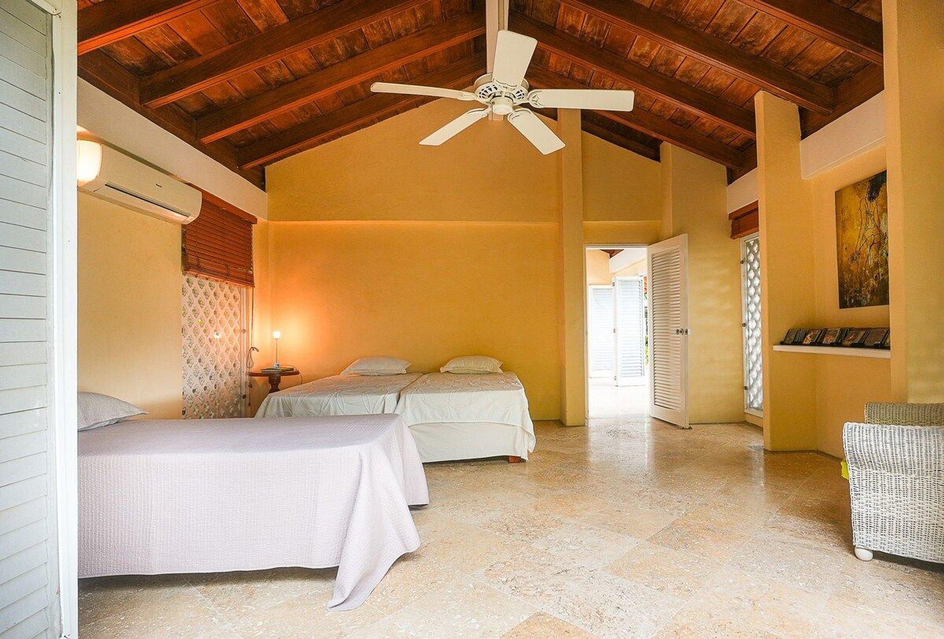 This beautiful house located in Baru, Cartagena, is the perfect place for a getaway with family and friends. The house is very spacious and has 5 bedrooms and 6 bathrooms, as well as a fully equipped kitchen, living room and dining room. In addition, the house has a swimming pool, parking and green areas. The house includes 2 employees that will do daily cleaning and cooking for you during the day. The house is located in a privileged and quiet area, where you can enjoy the Caribbean landscape.