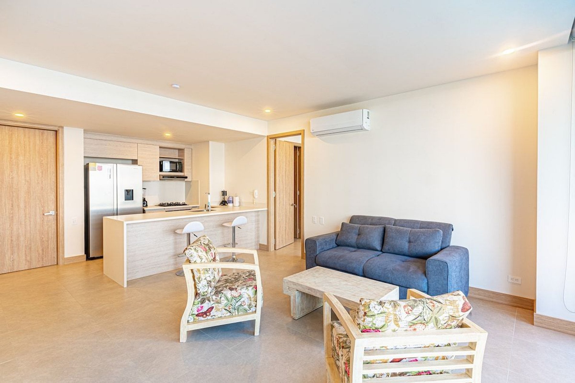The apartment has 2 bedrooms and 2 bathrooms. In the main room there are 2 queen beds with private bathroom and in the auxiliary room there are 2 double beds and private bathroom. The kitchen has all the necessary utensils to cook and the living room has a TV to enjoy with the family.