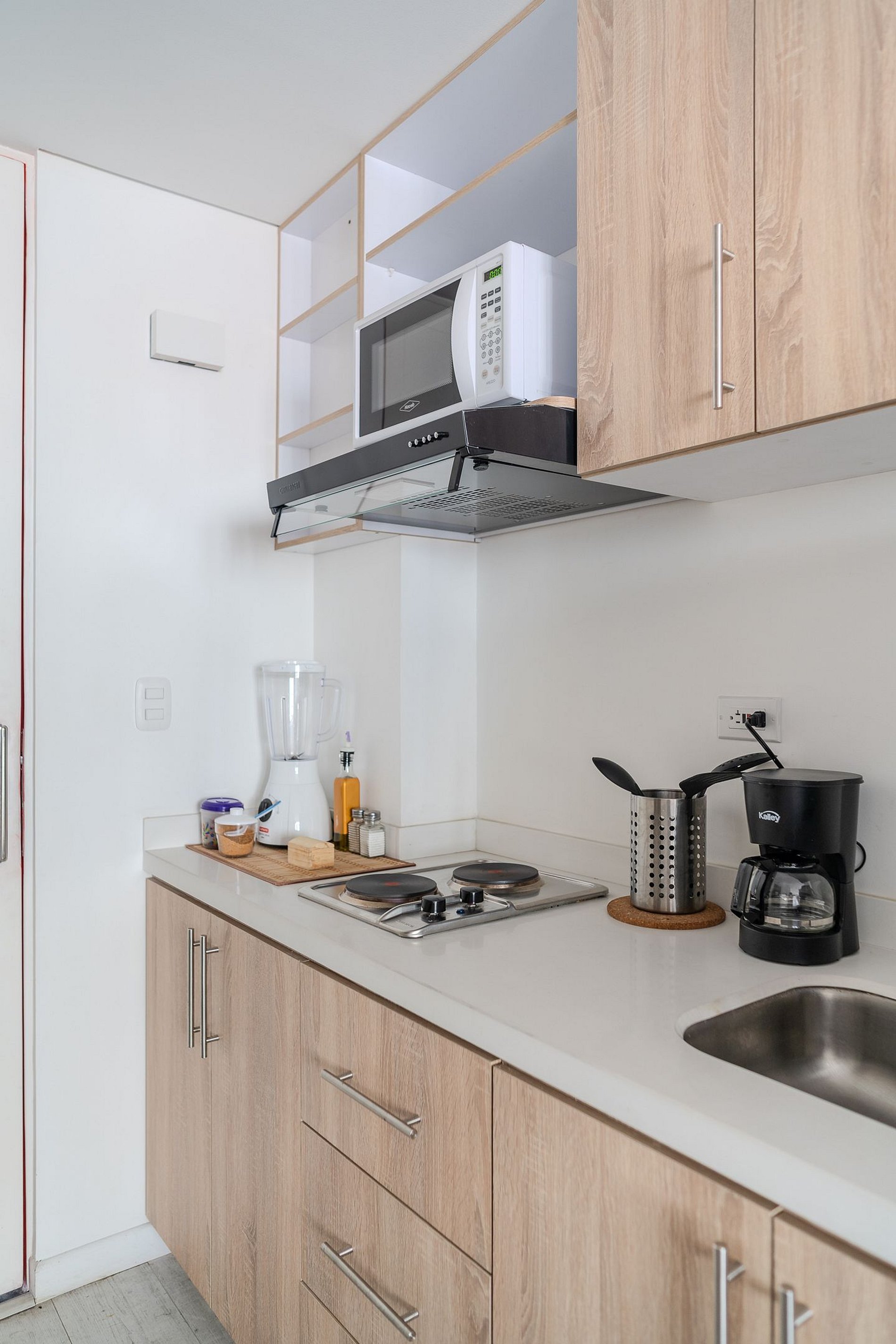 The kitchenette is equipped with a two-place electric stove, refrigerator, microwave, coffee maker, utensils and crockery for 2 people, perfect for preparing your meals during your stay. Everything has been thought for you to enjoy comfort, functionality and a cozy design.