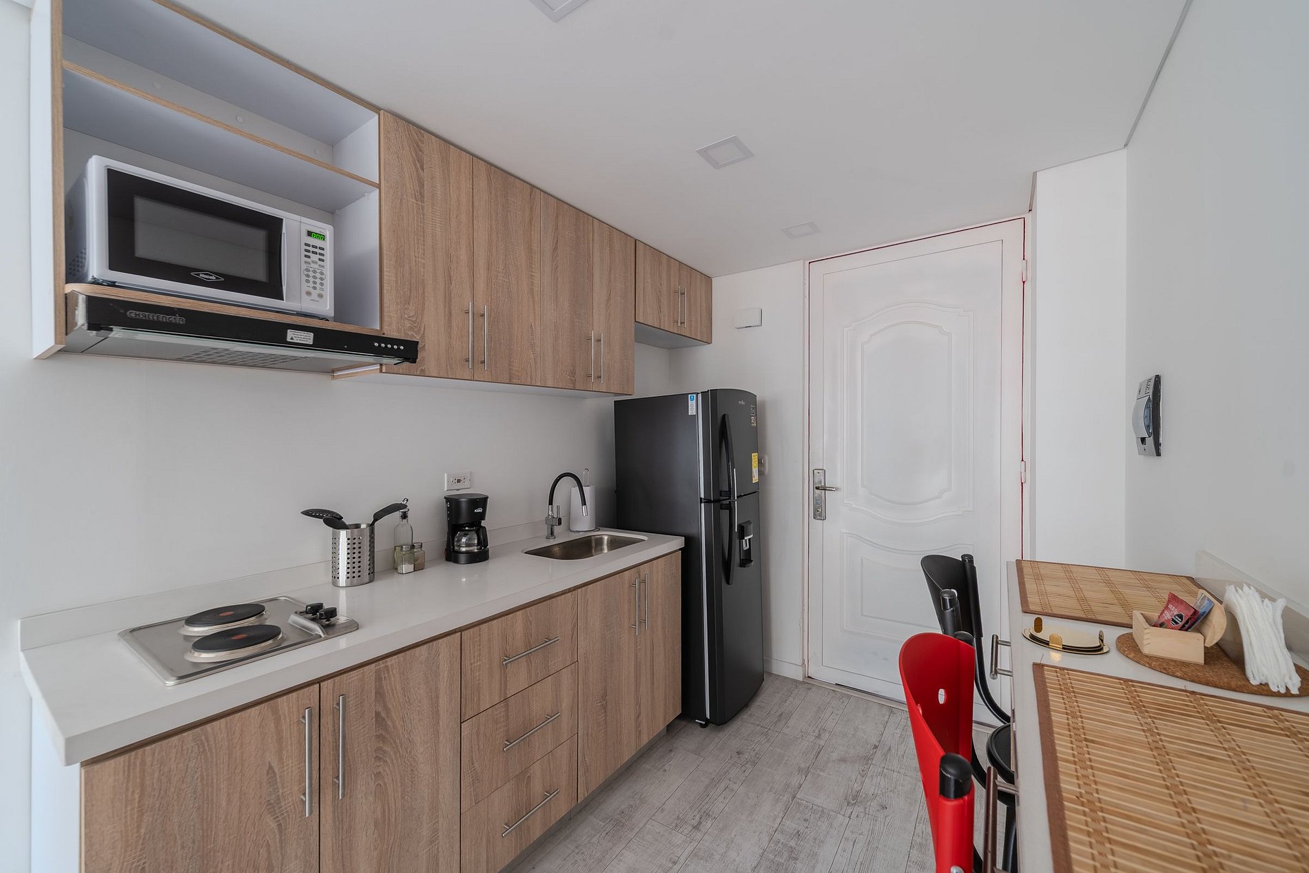 The kitchenette is equipped with a two-place electric stove, refrigerator, microwave, coffee maker, utensils and crockery for 2 people, perfect for preparing your meals during your stay. Everything has been thought for you to enjoy comfort, functionality and a cozy design.