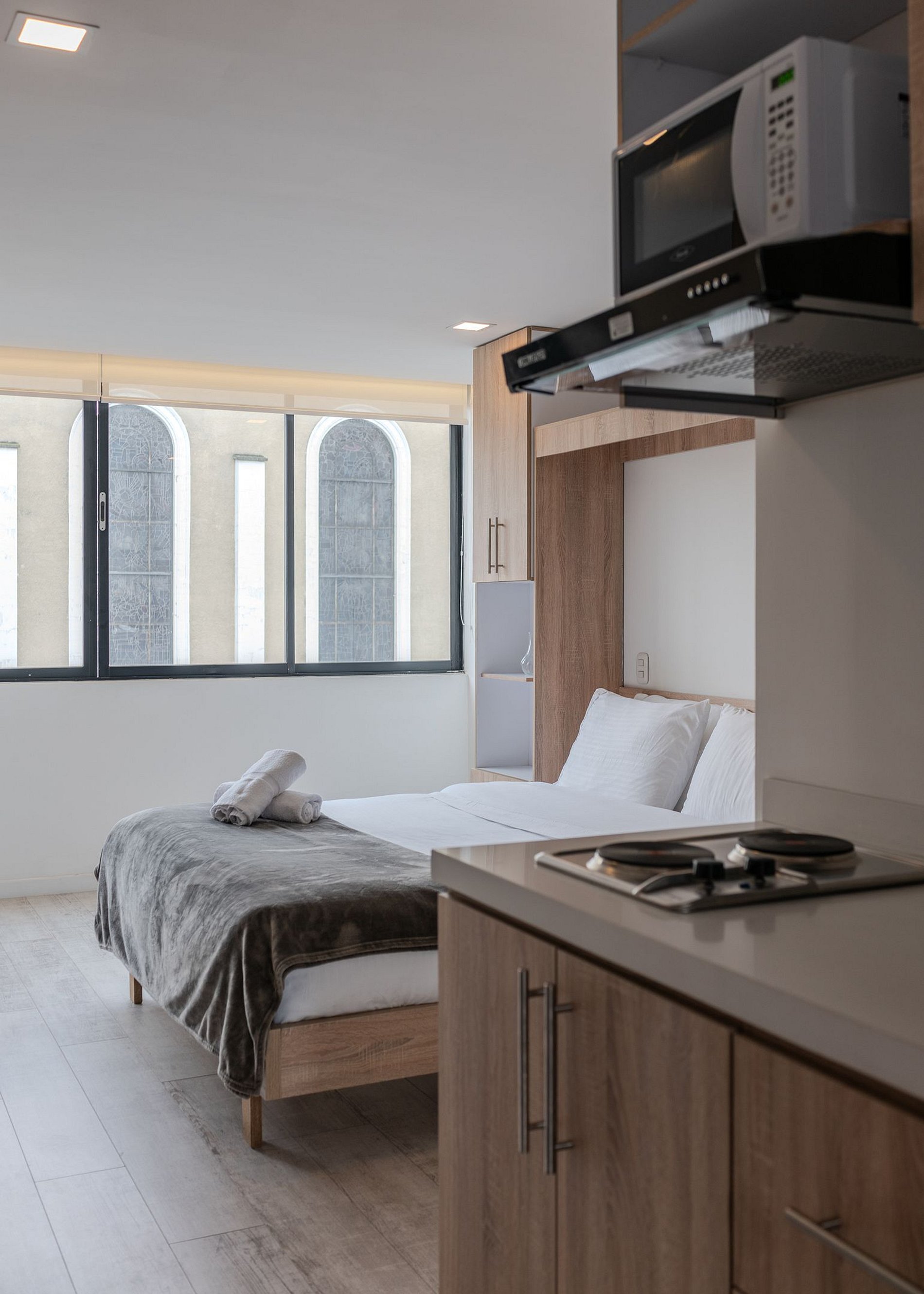 Atardecer 57 x Ahead offers 11 modern studio apartments in the heart of Teusaquillo, minutes away from the Movistar Arena, El Campín and Chapinero. Located in a strategic area with easy access to public transportation, universities, shopping centers and restaurants. Comfortable and well-designed spaces, ideal for travelers, managed by a professional team.
