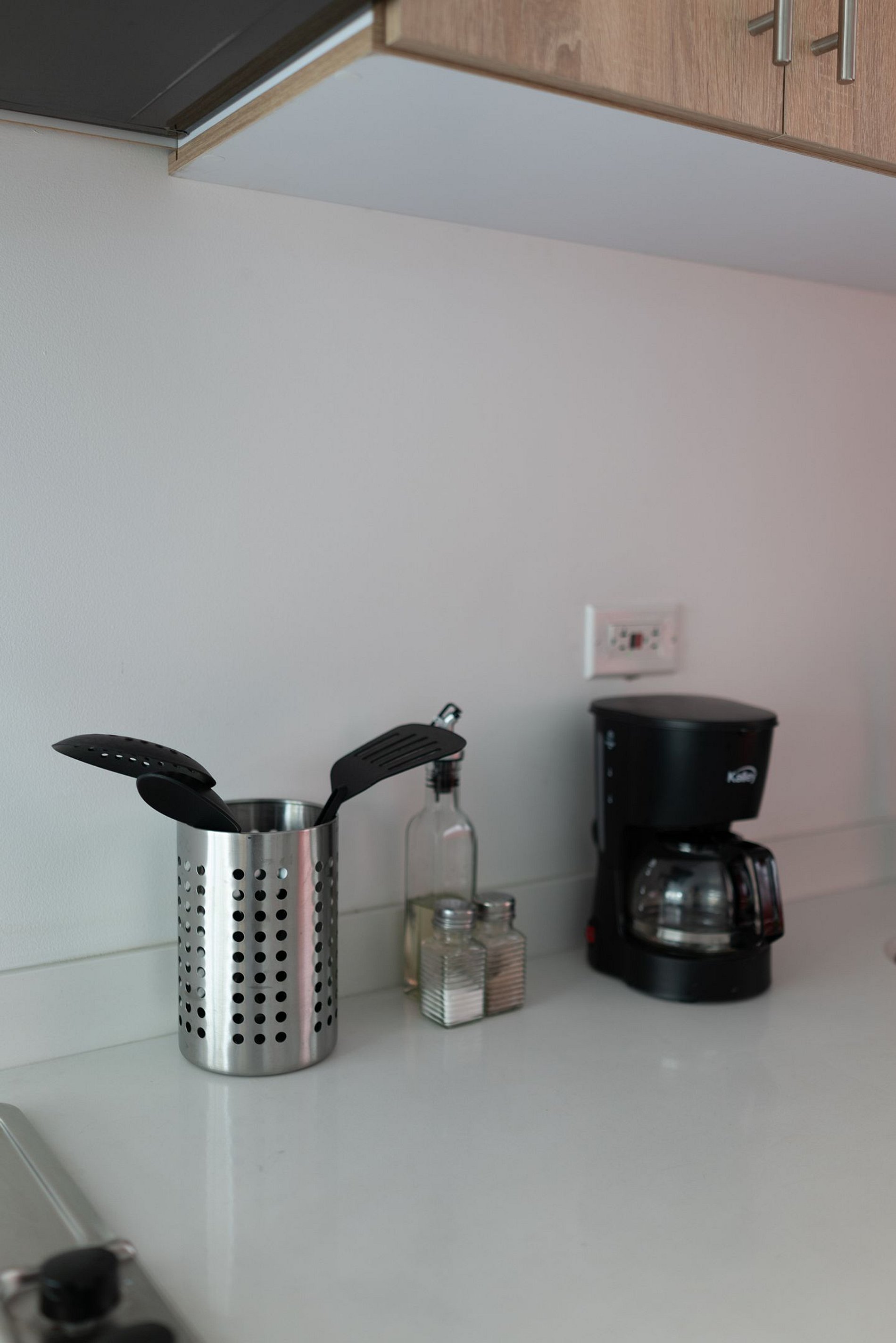 The kitchenette is equipped with a two-place electric stove, refrigerator, microwave, coffee maker, utensils and crockery for 2 people, perfect for preparing your meals during your stay. Everything has been thought for you to enjoy comfort, functionality and a cozy design.