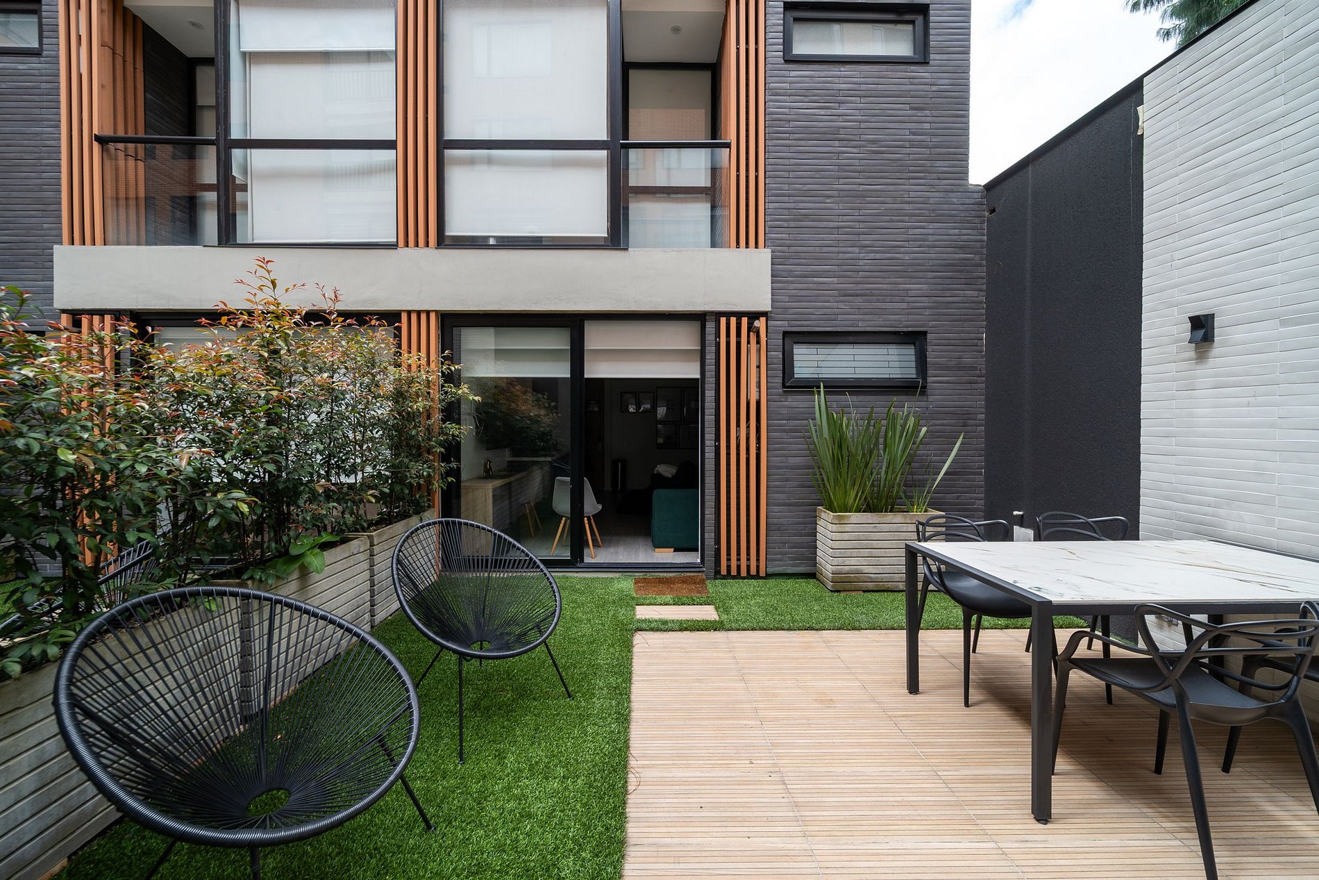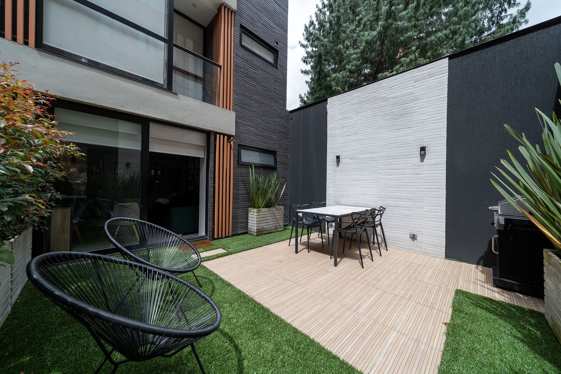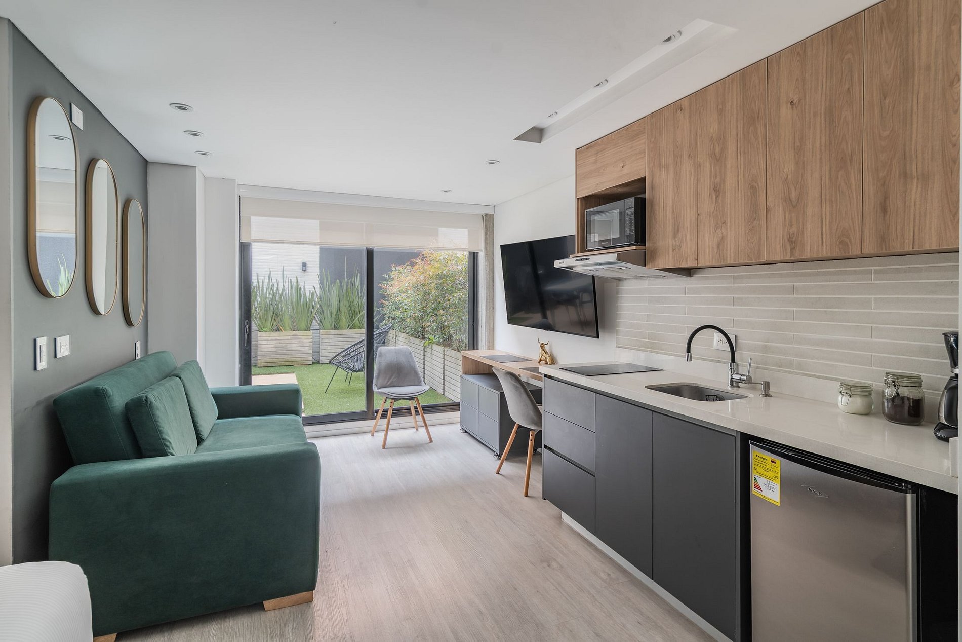 With a loft-like design and an efficient distribution in 28 m², the space integrates the bedroom with a cozy living room and a semi-double sofa bed. The open kitchen has a coffee maker, microwave oven, dishes and everything you need to feel at home. Adjacent to the sleeping area is a modern and functional private bathroom. One of the greatest charms of this apartment is its private terrace, a green oasis in the middle of the city. Surrounded by greenery and equipped with a dining table and comfortable chairs, it is the perfect place to enjoy an outdoor breakfast or relax with a glass of wine at sunset. The building is private and secure, with electronic locks and surveillance cameras. Its location in Chapinero puts you just steps away from El Campin Stadium and the Movistar Arena, surrounded by cafes, restaurants, stores and excellent transportation options. Ideal for those looking for comfort, style and an authentic connection to the city.
