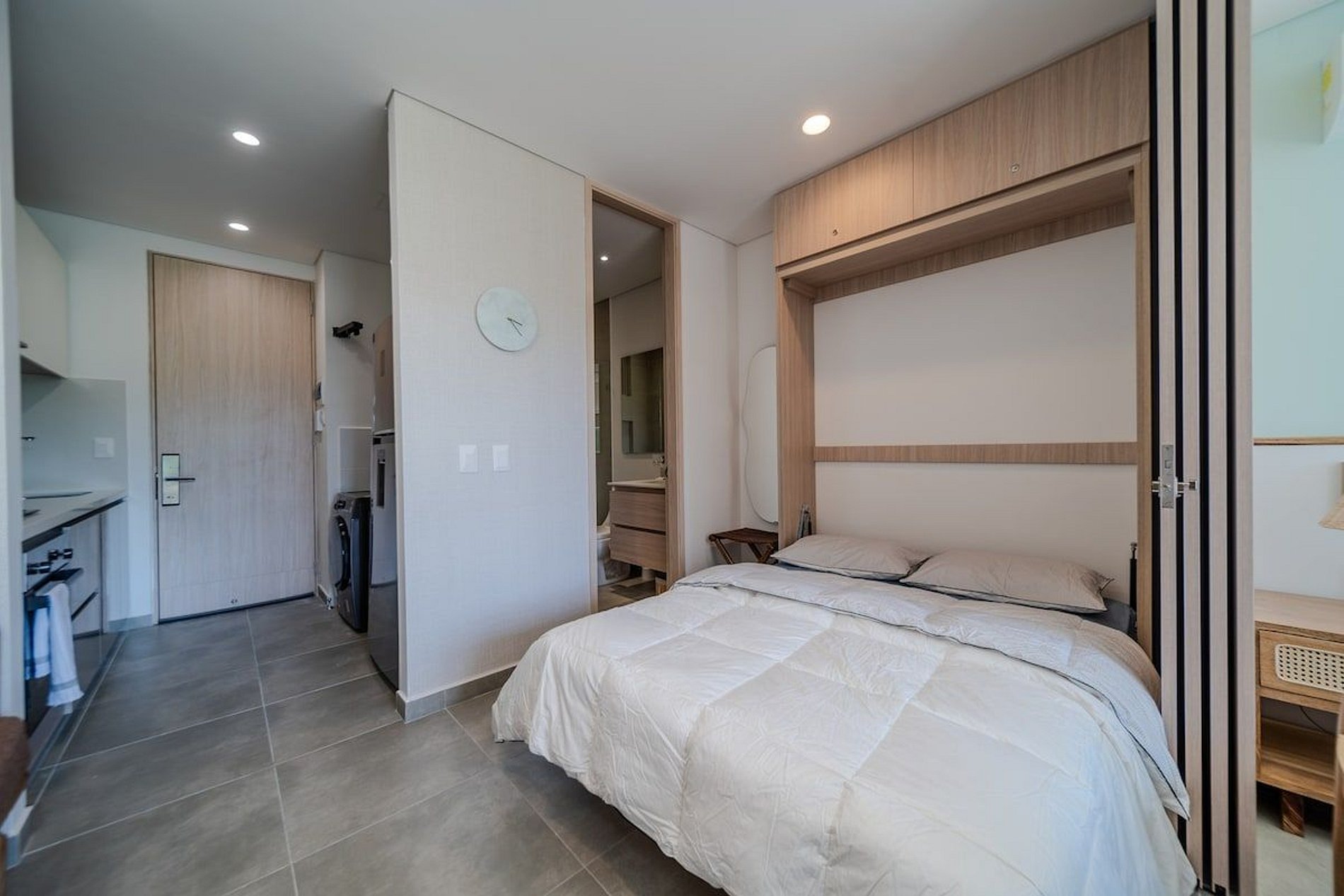 El apartamento de 36mts2, cuenta con 1 habitación principal con una cama queen y un balcón con una hermosa vista a las montañas. En la zona social, encontrarás una cama Murphy. Además, tiene 1 baño completo, una sala-comedor acogedora con ventilador de techo, y una cocina abierta completamente equipada.