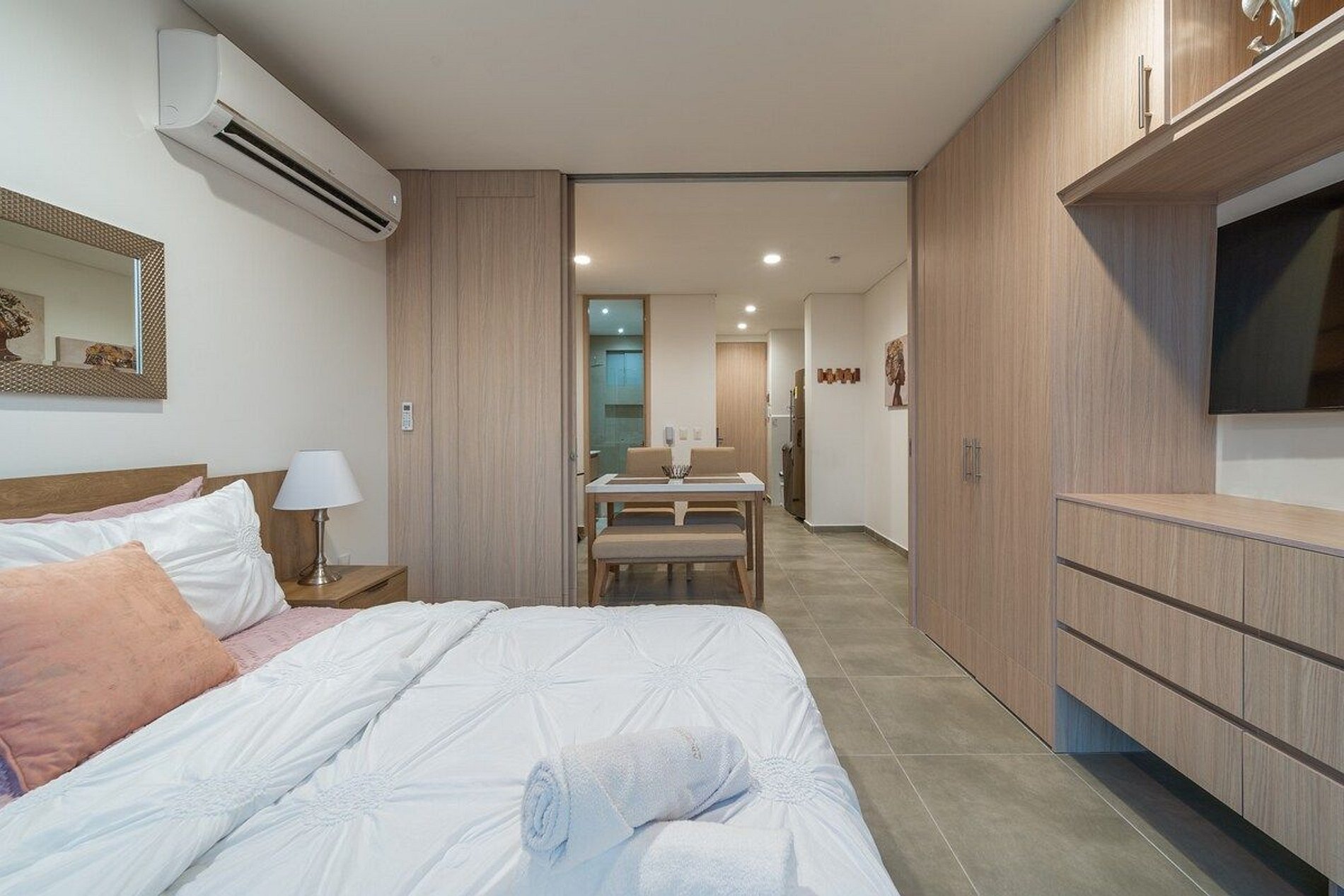 El apartamento está dotado con aire acondicionado, TV, y WiFi, asegurando que tengas todas las comodidades para una estancia placentera, ya sea corta o larga. El espacio está completamente amoblado y decorado con un estilo cálido, ideal para que te sientas como en casa.