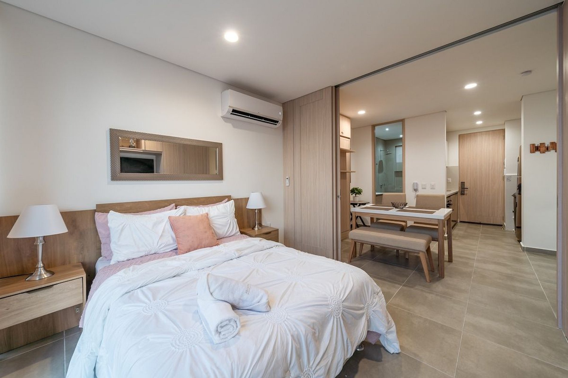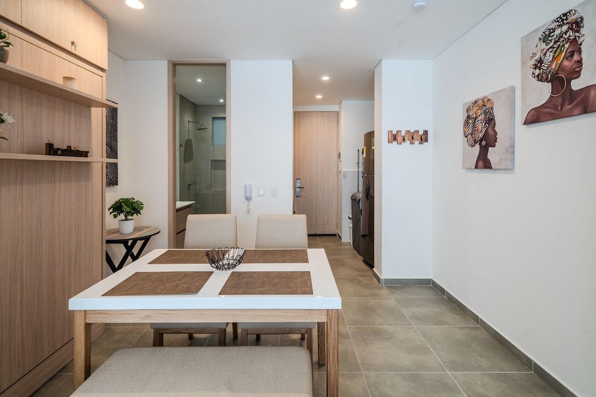 El apartamento está dotado con aire acondicionado, TV, y WiFi, asegurando que tengas todas las comodidades para una estancia placentera, ya sea corta o larga. El espacio está completamente amoblado y decorado con un estilo cálido, ideal para que te sientas como en casa.