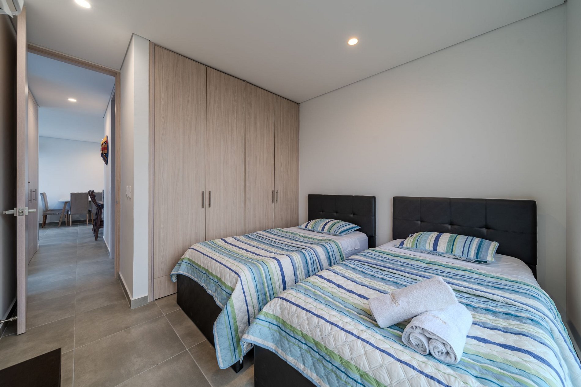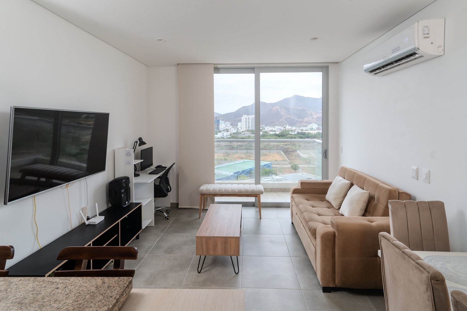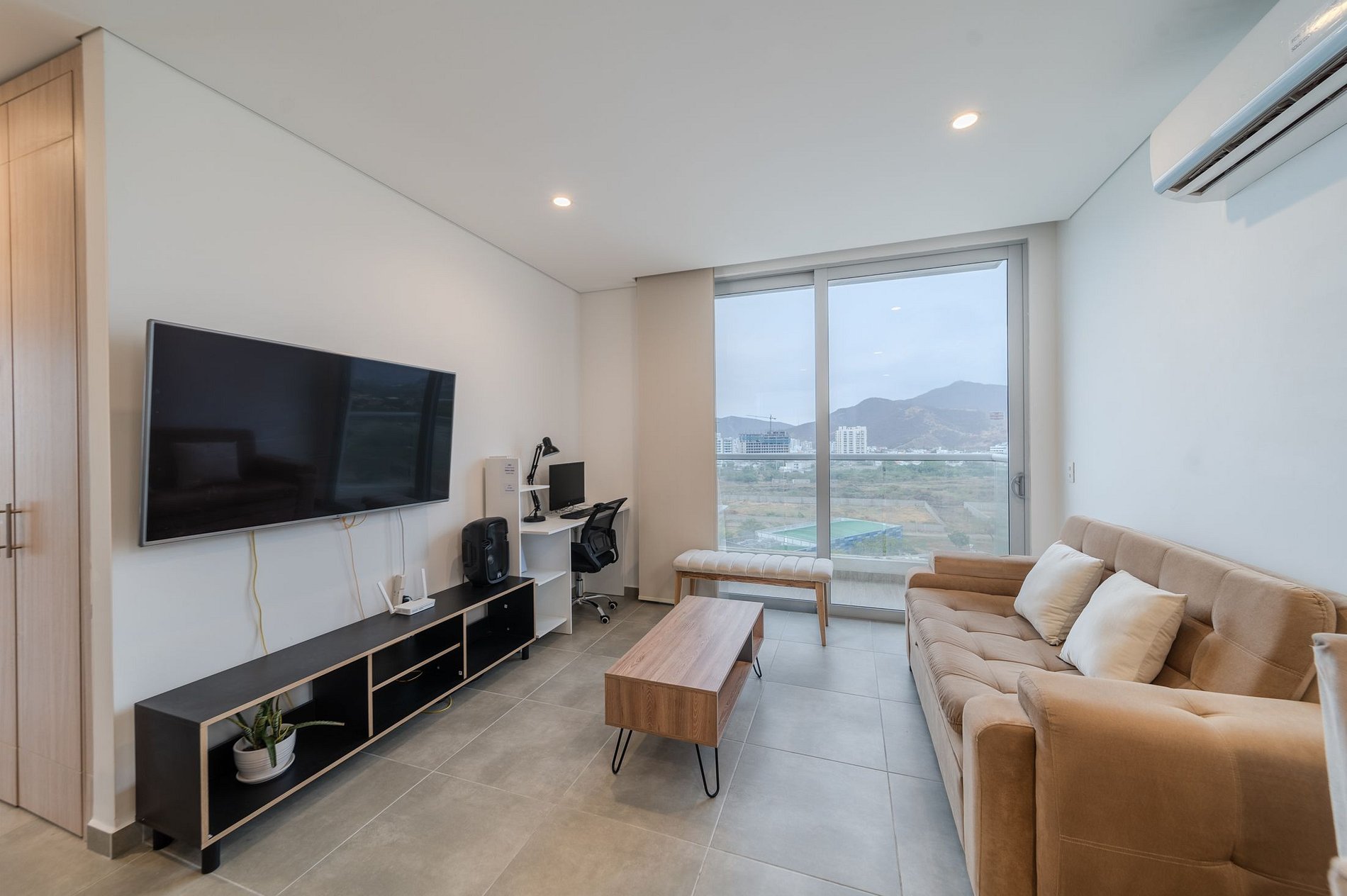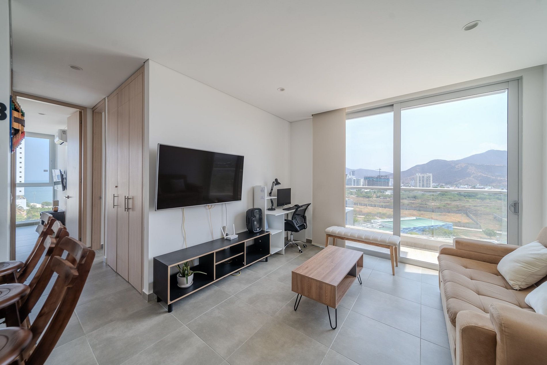 Este moderno apartamento de 78,6 m², ubicado en el piso 9 de un edificio nuevo a pocos metros de la hermosa Playa Salguero, es el lugar ideal para familias o grupos que buscan comodidad y cercanía al mar. Cuenta con dos habitaciones, dos baños, sala-comedor y dos balcones desde donde podrás disfrutar de una vista encantadora. La cocina integral abierta tipo americano está equipada con estufa a gas de cuatro puestos, horno, microondas, nevera y lavadora. La habitación principal ofrece una cama doble, un sofá cama individual, baño privado y TV Smart. La habitación auxiliar dispone de dos camas sencillas y TV Smart, mientras que en la sala encontrarás un sofá cama doble y TV Smart. El apartamento está totalmente amoblado y equipado con aire acondicionado en todas las habitaciones, escritorio con computador y parqueadero privado. El edificio ofrece espacios pensados para el descanso y la diversión, como piscina de adultos y niños, jacuzzis, sauna, turco, gimnasio, salón de juegos y un minimarket dentro del conjunto. Todo lo que necesitas para disfrutar de una estadía perfecta en una de las zonas más atractivas de Santa Marta, a solo pasos del mar.