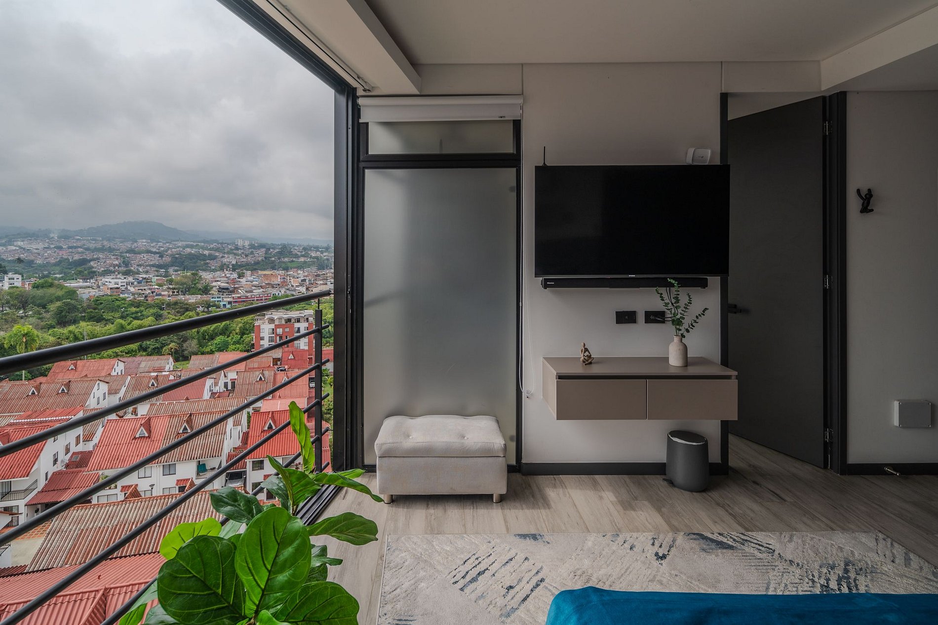 🛌 El Loft: Este lindo y bien distribuido apartamento tipo loft cuenta con una cama queen. Dispone de aire acondicionado, un baño social y una cocina completamente equipada 🍳. Las grandes ventanas permiten la entrada de luz natural y ofrecen una vista panorámica de la ciudad.