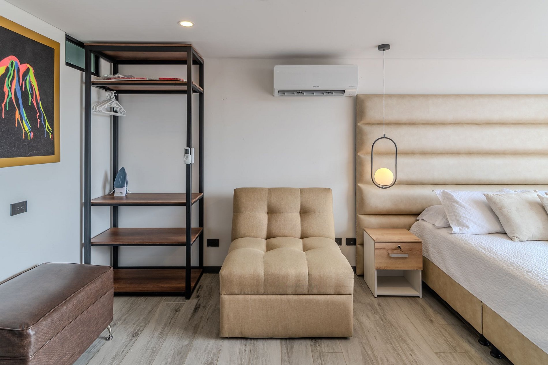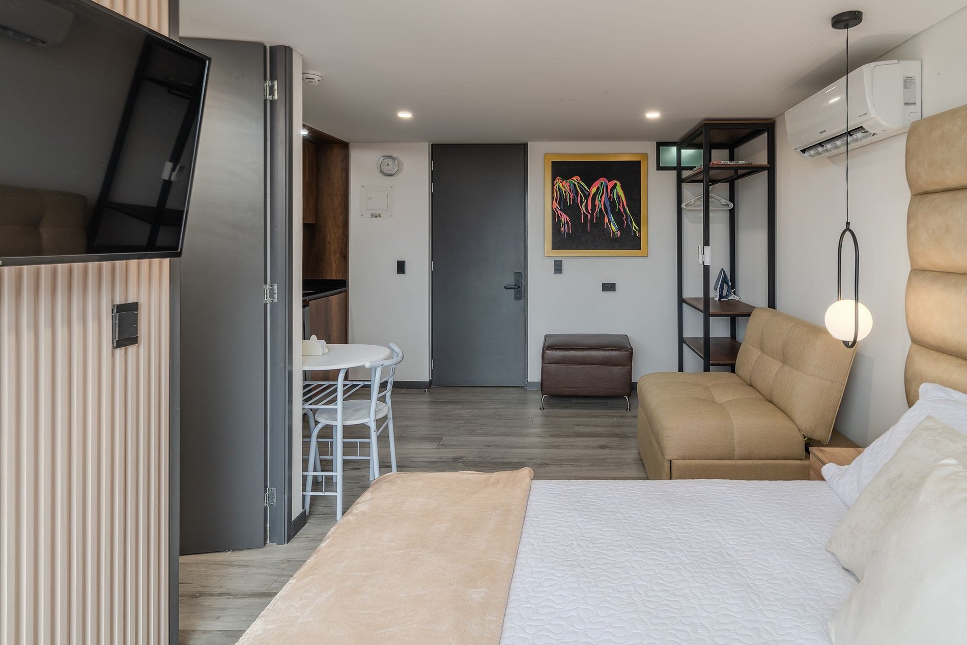 🛌 El Loft: Este lindo y bien distribuido apartamento tipo loft cuenta con una cama tamaño Queen y un sofá cama. Dispone de aire acondicionado, un baño social y una cocina completamente equipada 🍳. Además, ofrece un balcón y una vista encantadora a la ciudad.