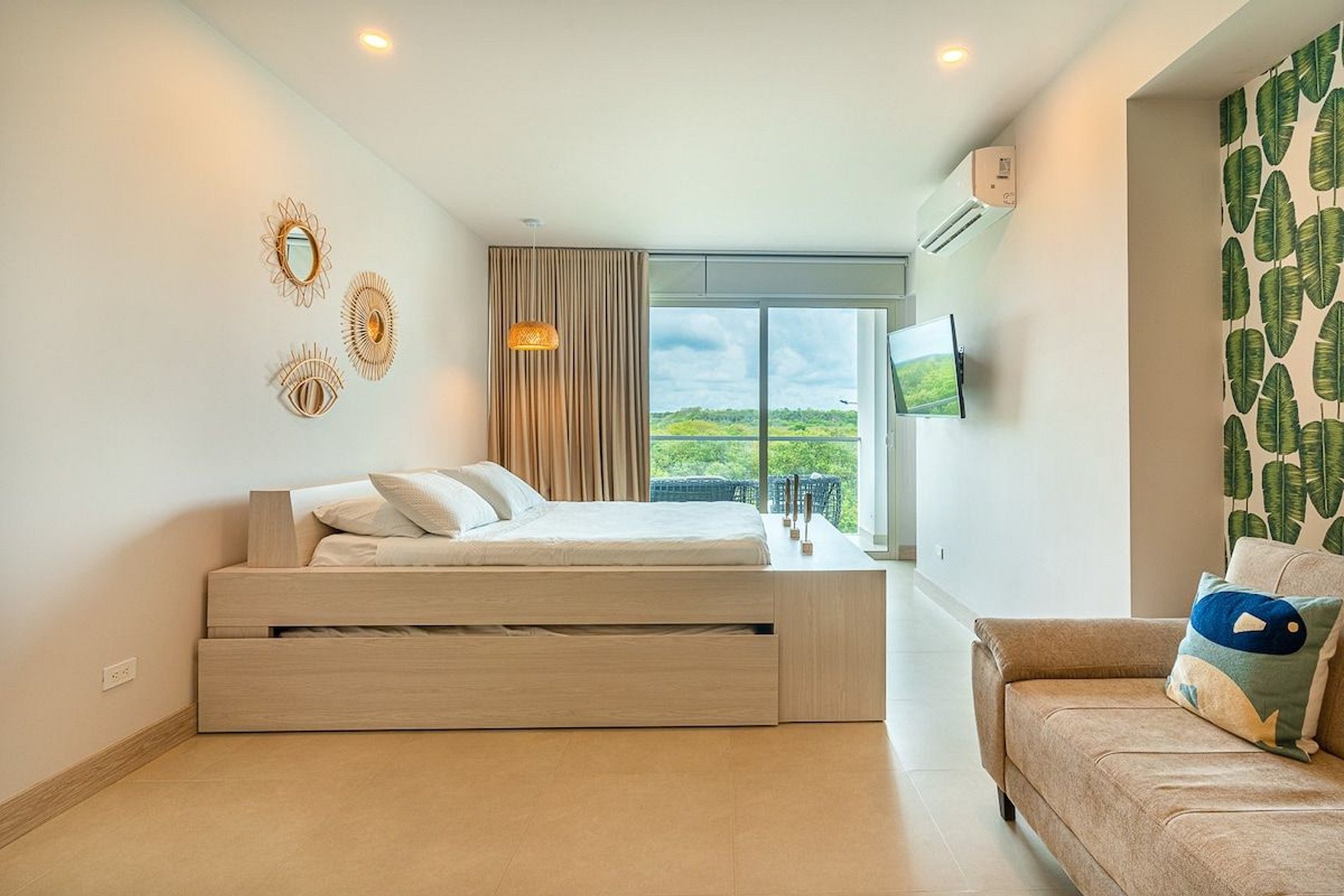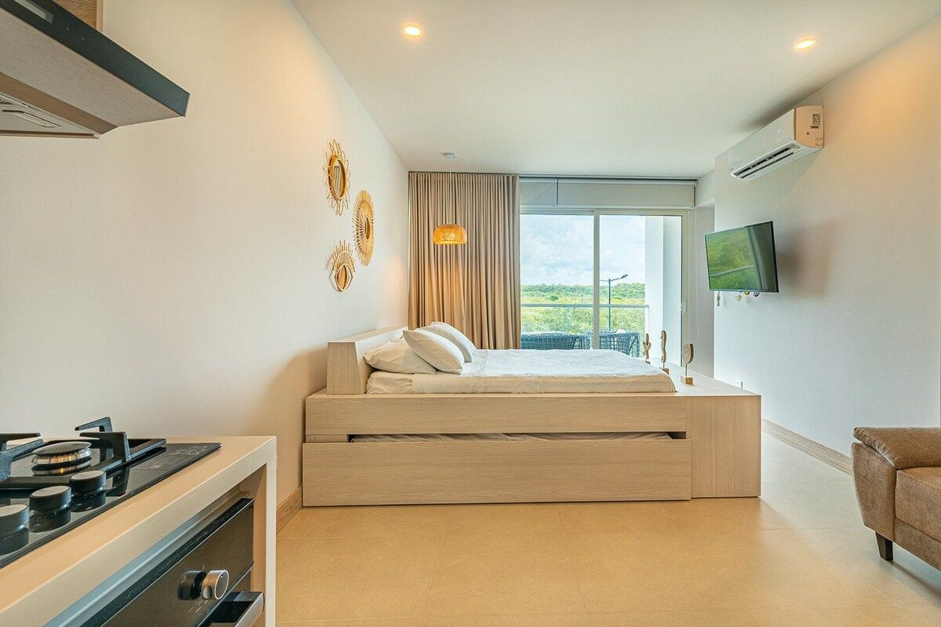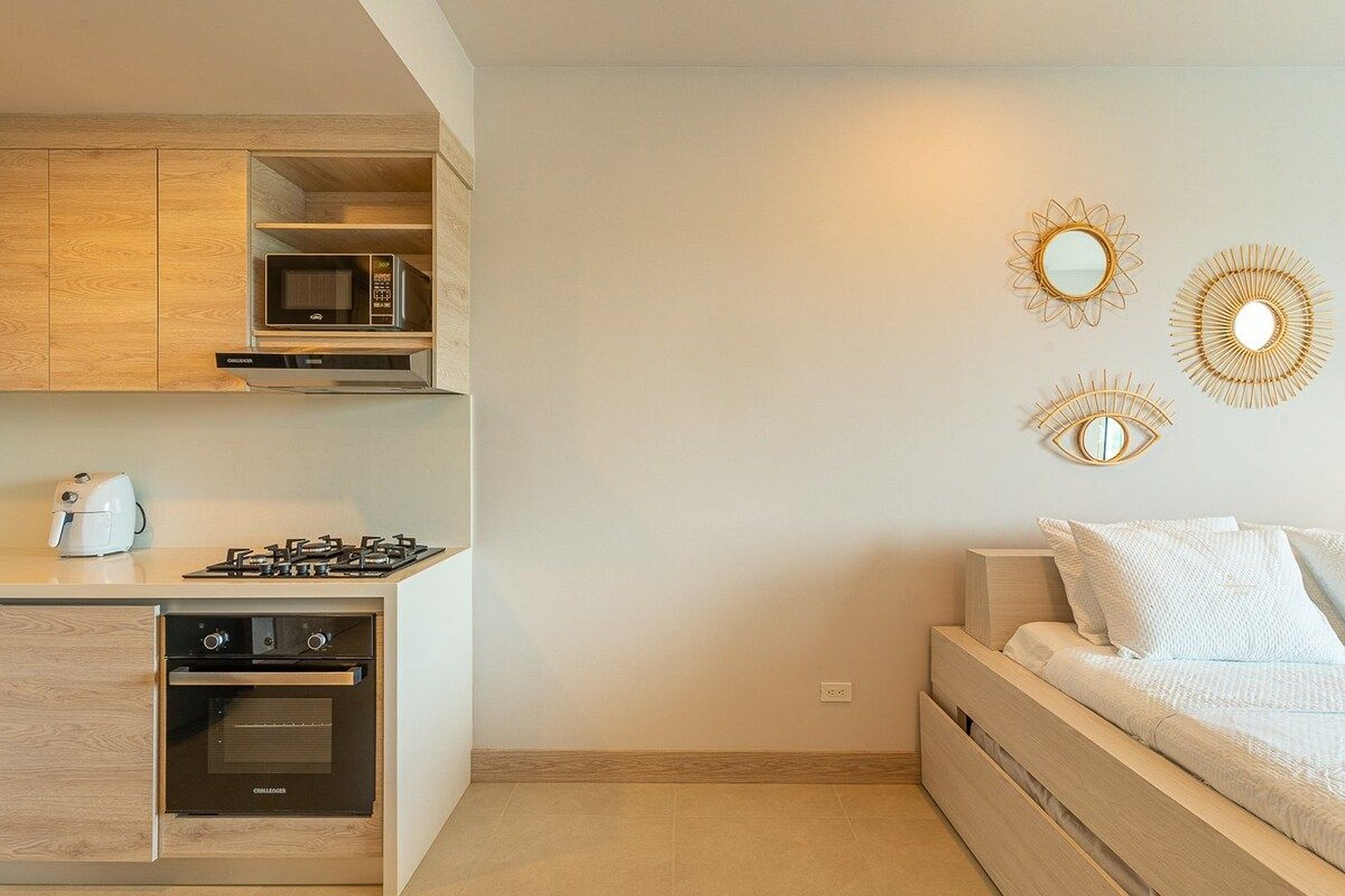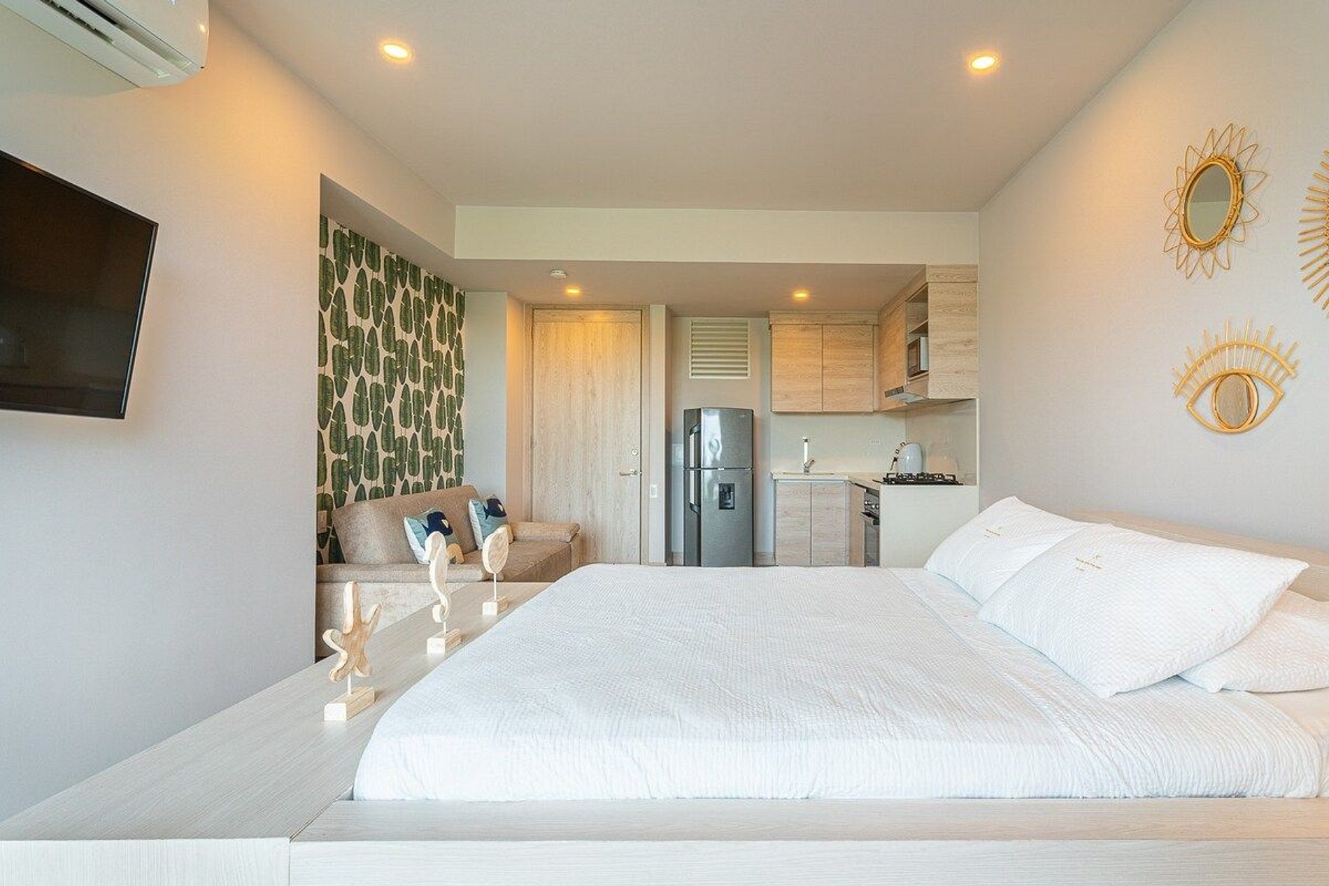 Es un apartaestudio con una cama cama doble, dos camas sencillas tipo nido y un sofa cama. Tiene el baño al lado de la habitación. La cocina esta acondicionada con todos los utensilios necesarios para la estadía.