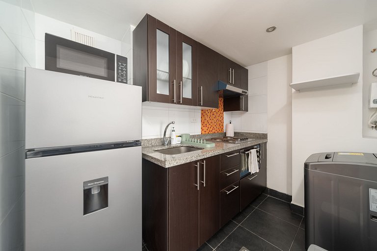 La cocina, completamente equipada, se convierte en el lugar ideal para preparar deliciosos platos típicos colombianos. Imagina cocinar un ajiaco o unas arepas, disfrutando de los aromas que evocan la calidez de nuestra tierra.