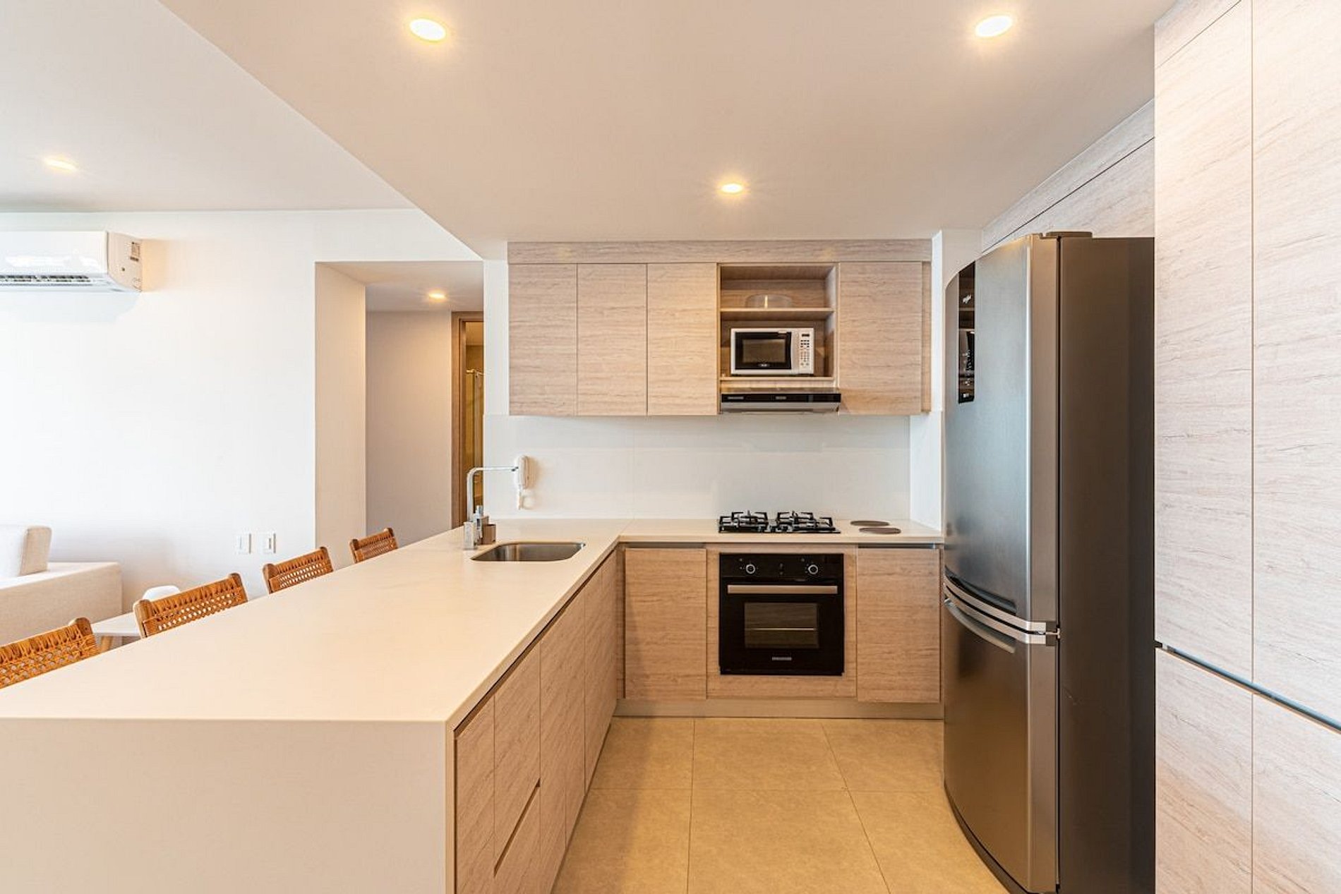 El apartamento cuenta con 3 habitaciones. La habitación principal tiene 2 camas dobles con baño privado. Y las habitaciones auxiliares tienen 2 camas semi dobles cada una. La cocina viene totalmente equipada, con una sala y balcón con una hermosa vista.