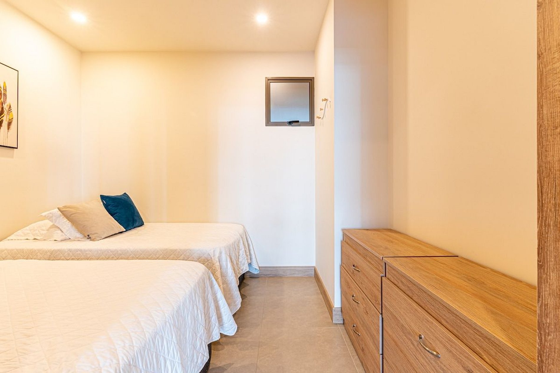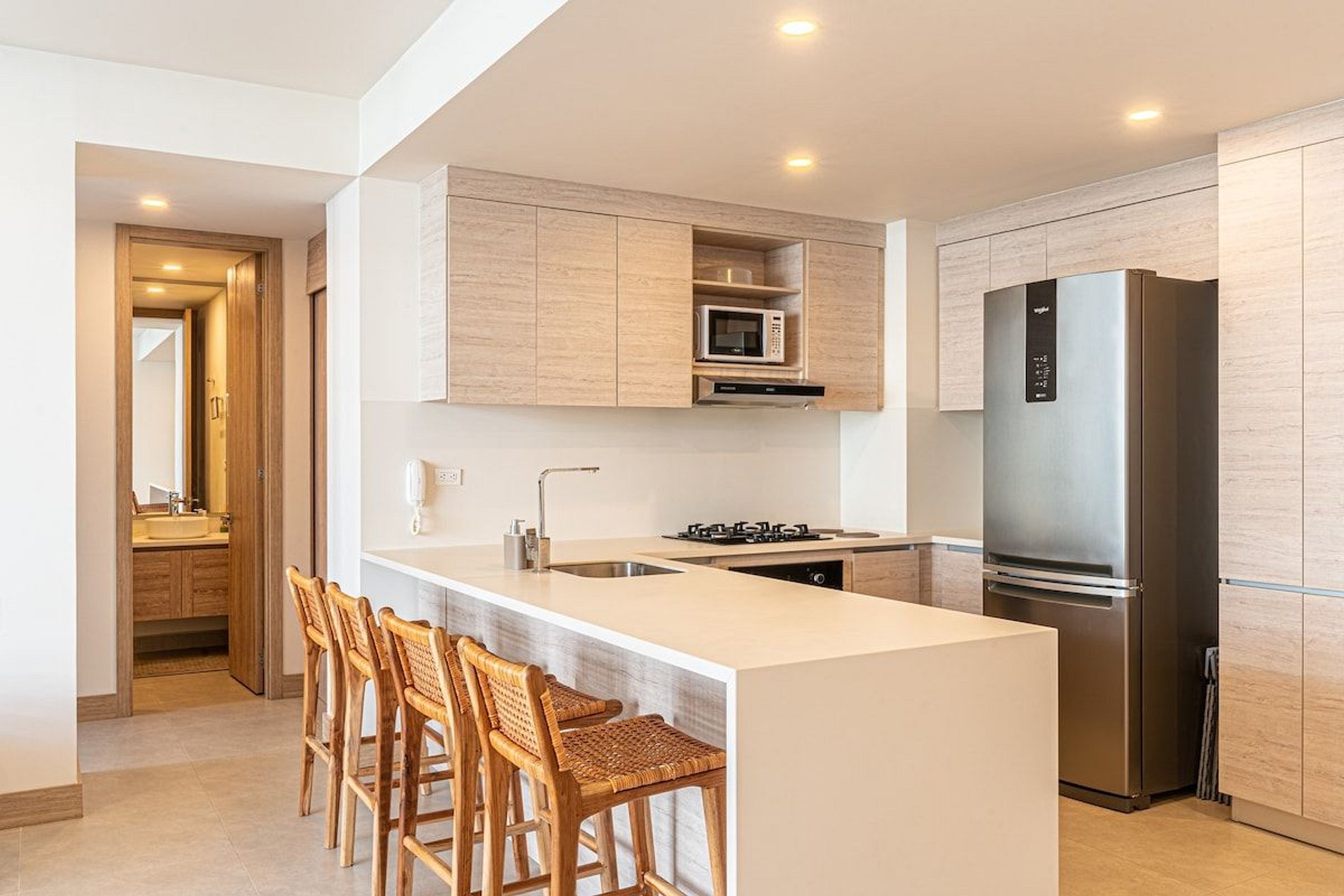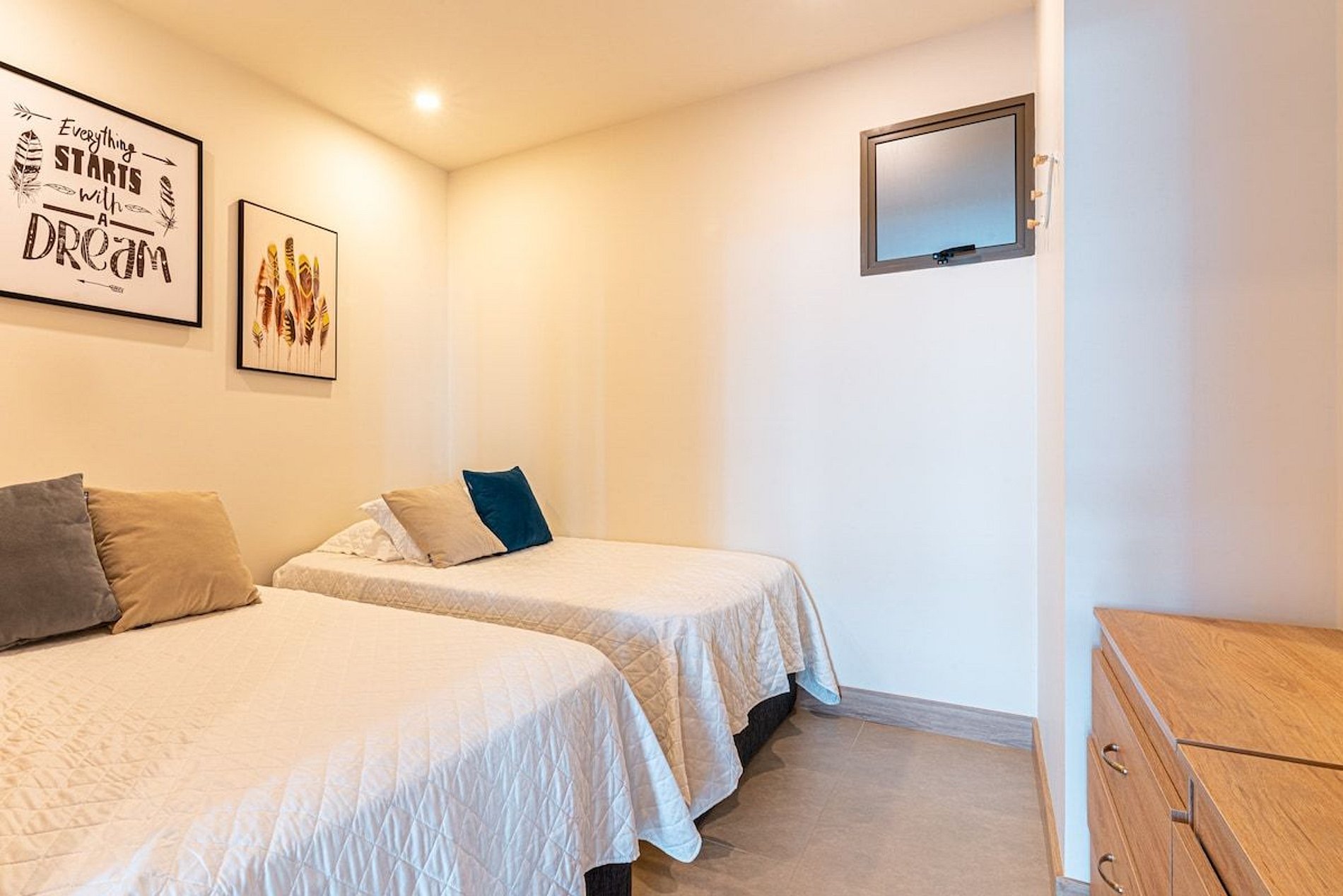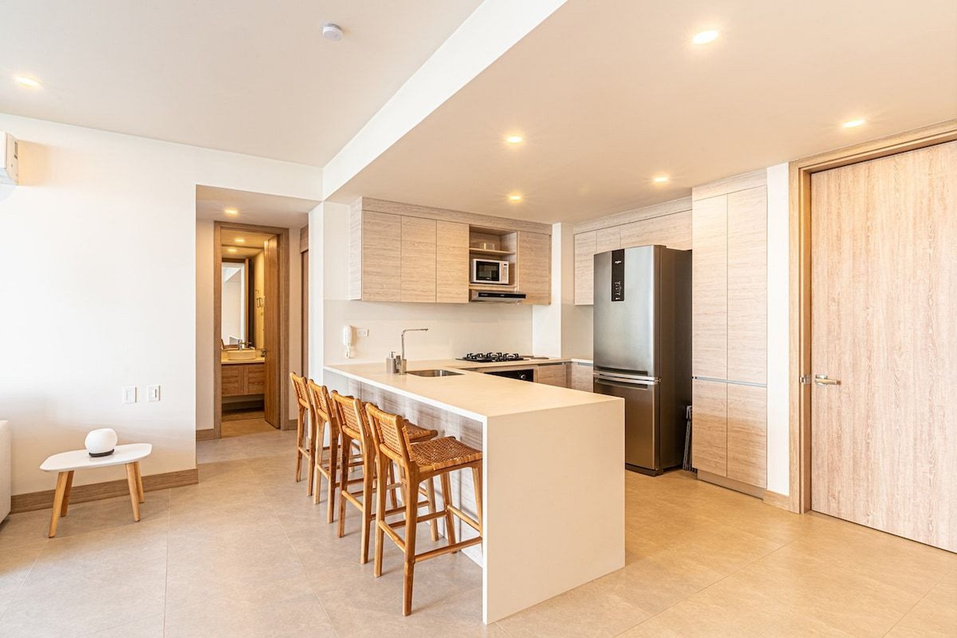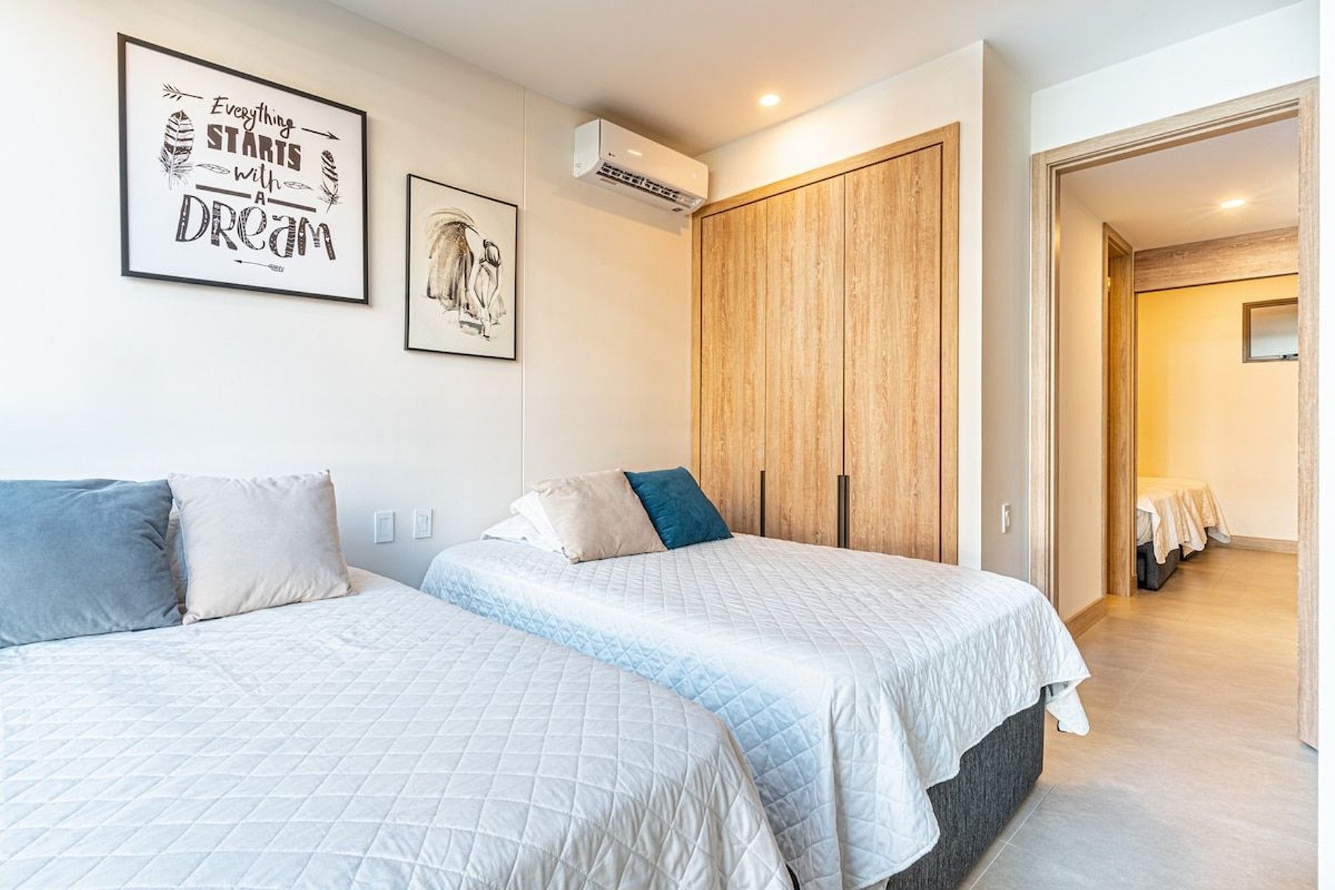 El apartamento cuenta con 3 habitaciones. La habitación principal tiene 2 camas dobles con baño privado. Y las habitaciones auxiliares tienen 2 camas semi dobles cada una. La cocina viene totalmente equipada, con una sala y balcón con una hermosa vista.