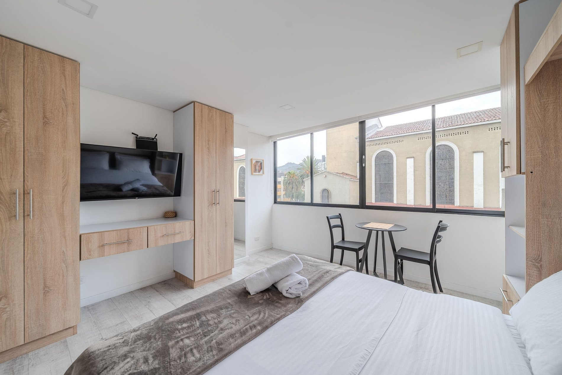 Disfruta de un apartaestudio cómodo, bien distribuido y lleno de luz, ideal para descansar, trabajar o explorar la ciudad. Cuenta con una habitación con cama doble y un sofacama y un baño. Ademas, de amenidades como WIFI y agua caliente.