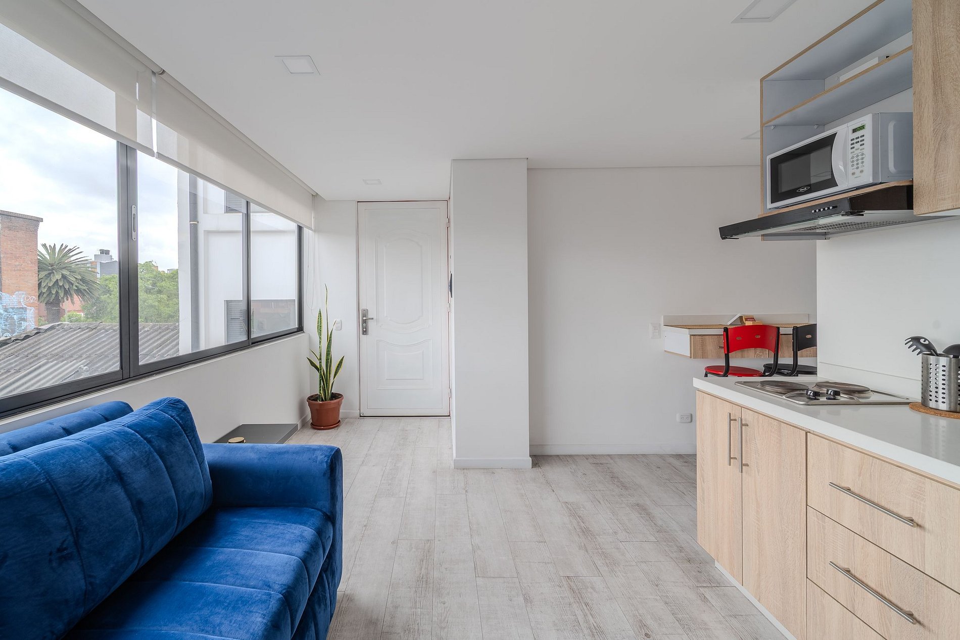 Este apartaestudio de 34 m² es perfecto para viajeros que buscan una estadía práctica, bien equipada y con excelente ubicación. La cocina pequeña está equipada con estufa eléctrica de dos puestos, nevera, microondas, cafetera, utensilios y loza para 4 personas, perfecta para preparar tus comidas durante la estadía. Todo ha sido pensado para que disfrutes de comodidad, funcionalidad y un diseño acogedor.