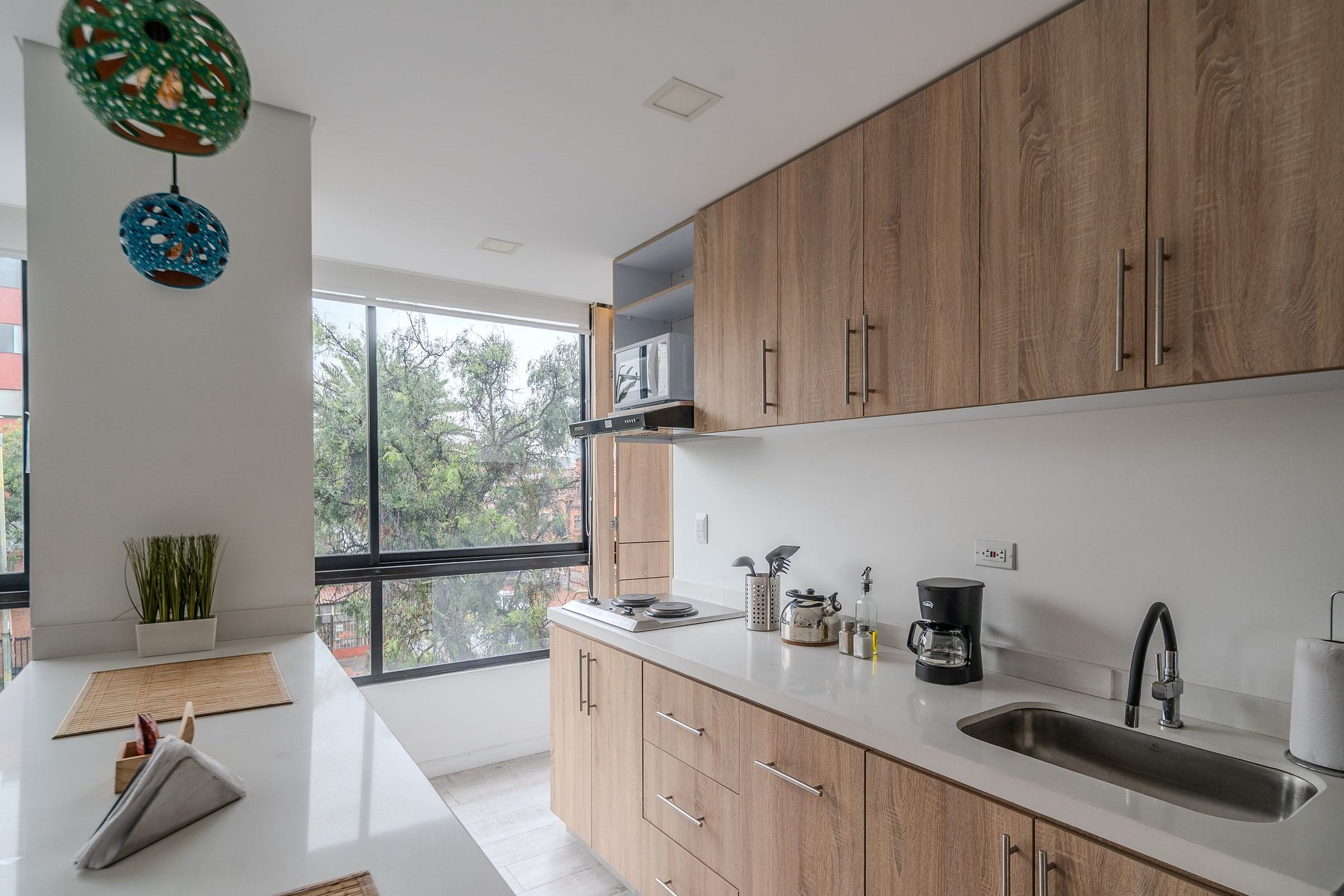 Este apartaestudio de 47 m² es perfecto para viajeros que buscan una estadía práctica, bien equipada y con excelente ubicación. La cocina tipo americana está equipada con estufa eléctrica de dos puestos, nevera, microondas, cafetera, utensilios y loza para 4 personas, perfecta para preparar tus comidas durante la estadía. Todo ha sido pensado para que disfrutes de comodidad, funcionalidad y un diseño acogedor.