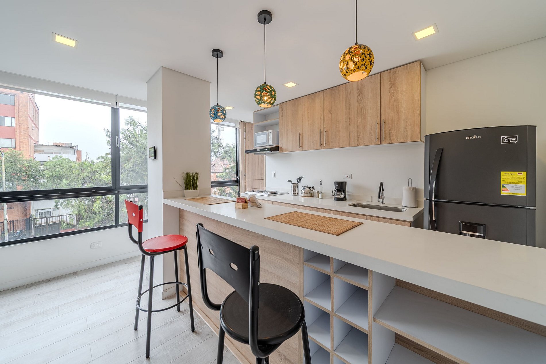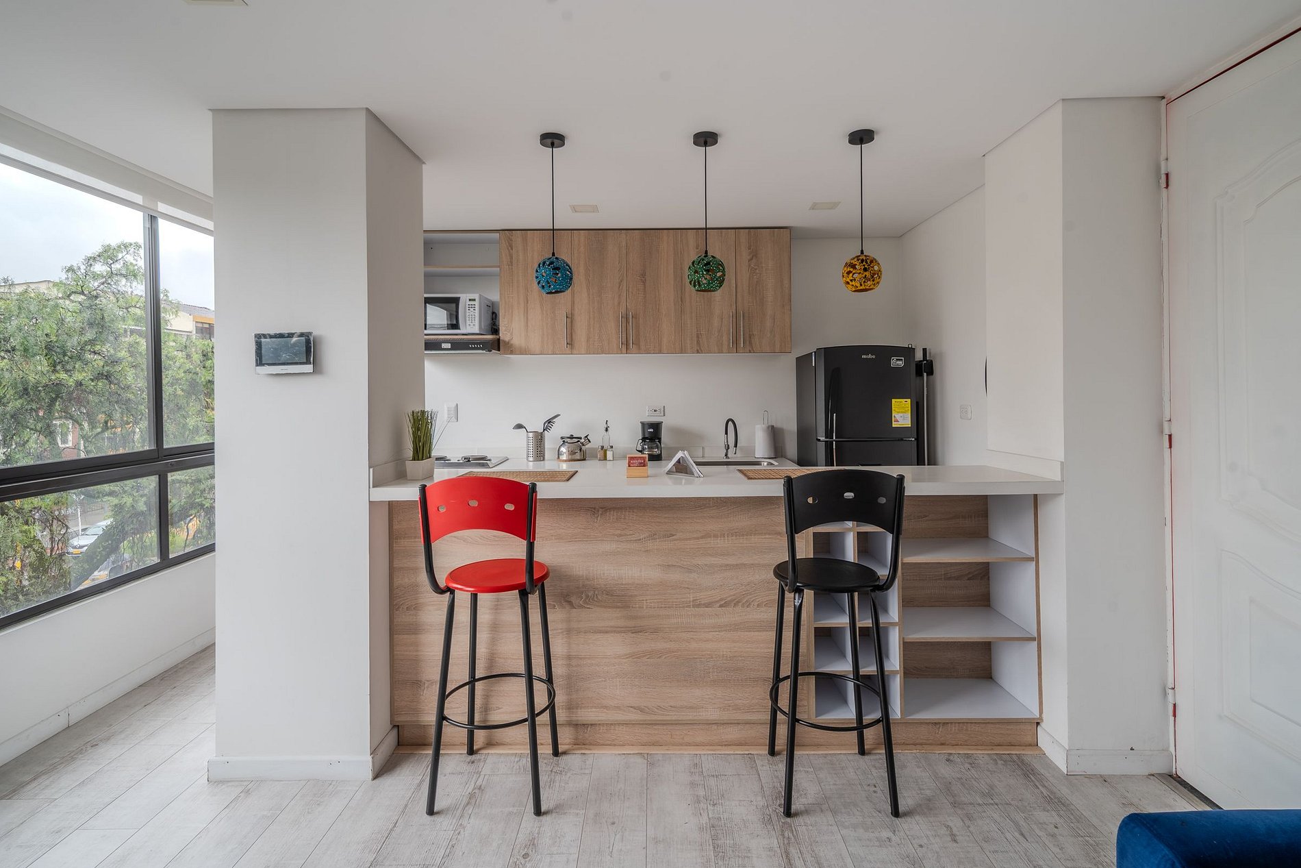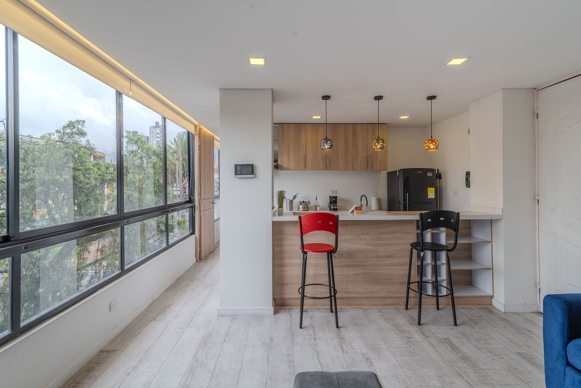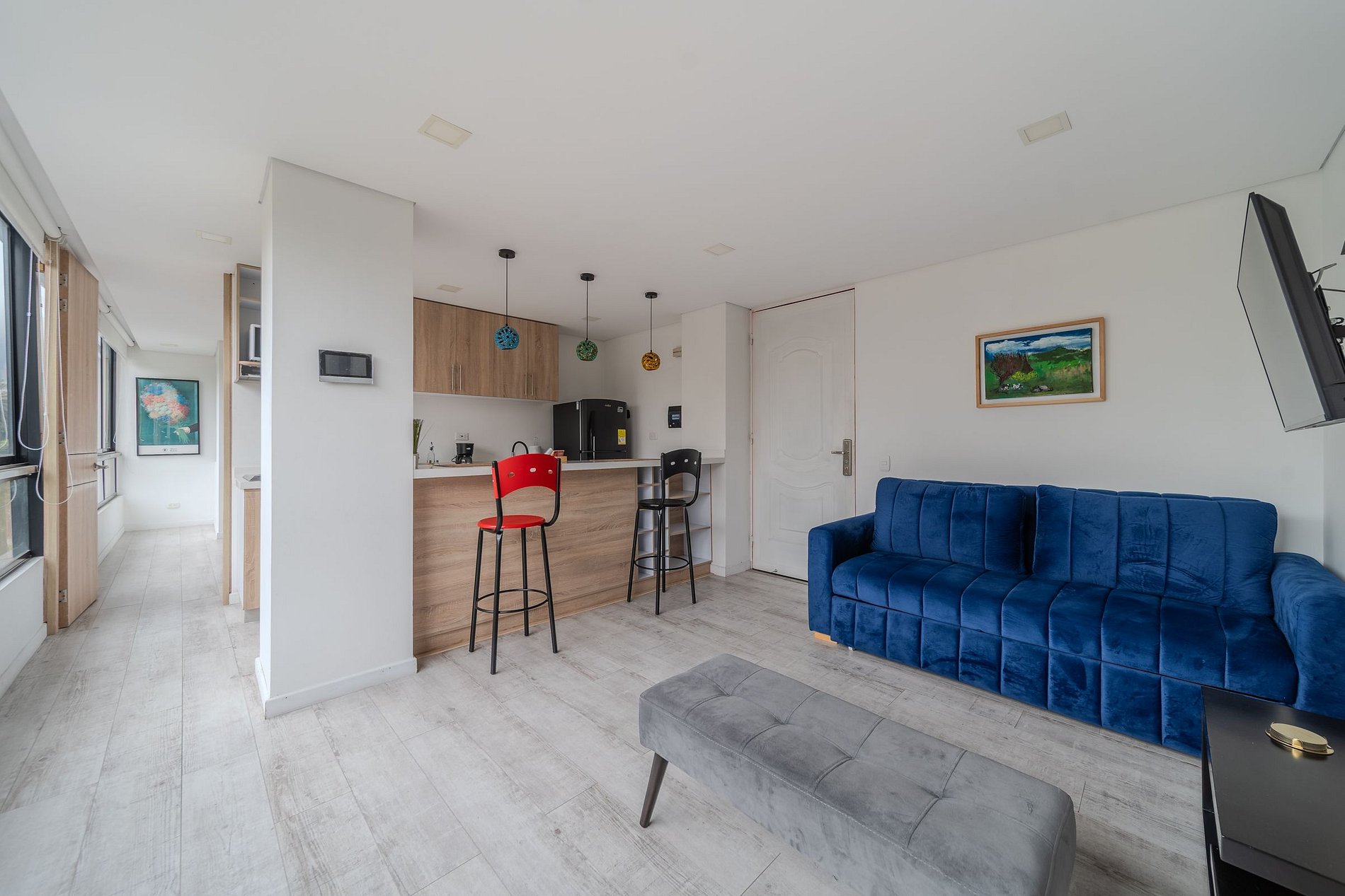 Este apartaestudio de 47 m² es perfecto para viajeros que buscan una estadía práctica, bien equipada y con excelente ubicación. La cocina tipo americana está equipada con estufa eléctrica de dos puestos, nevera, microondas, cafetera, utensilios y loza para 4 personas, perfecta para preparar tus comidas durante la estadía. Todo ha sido pensado para que disfrutes de comodidad, funcionalidad y un diseño acogedor.