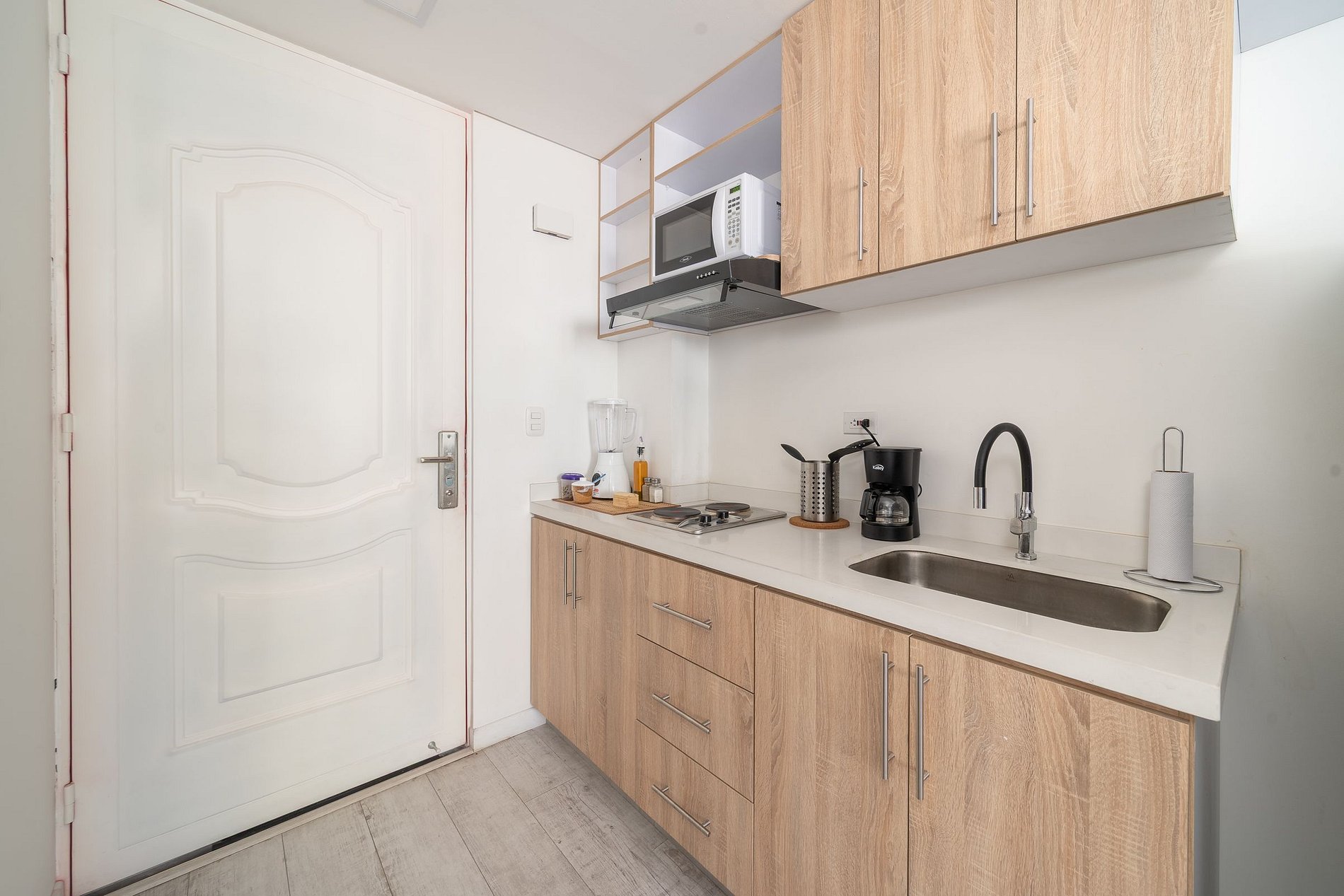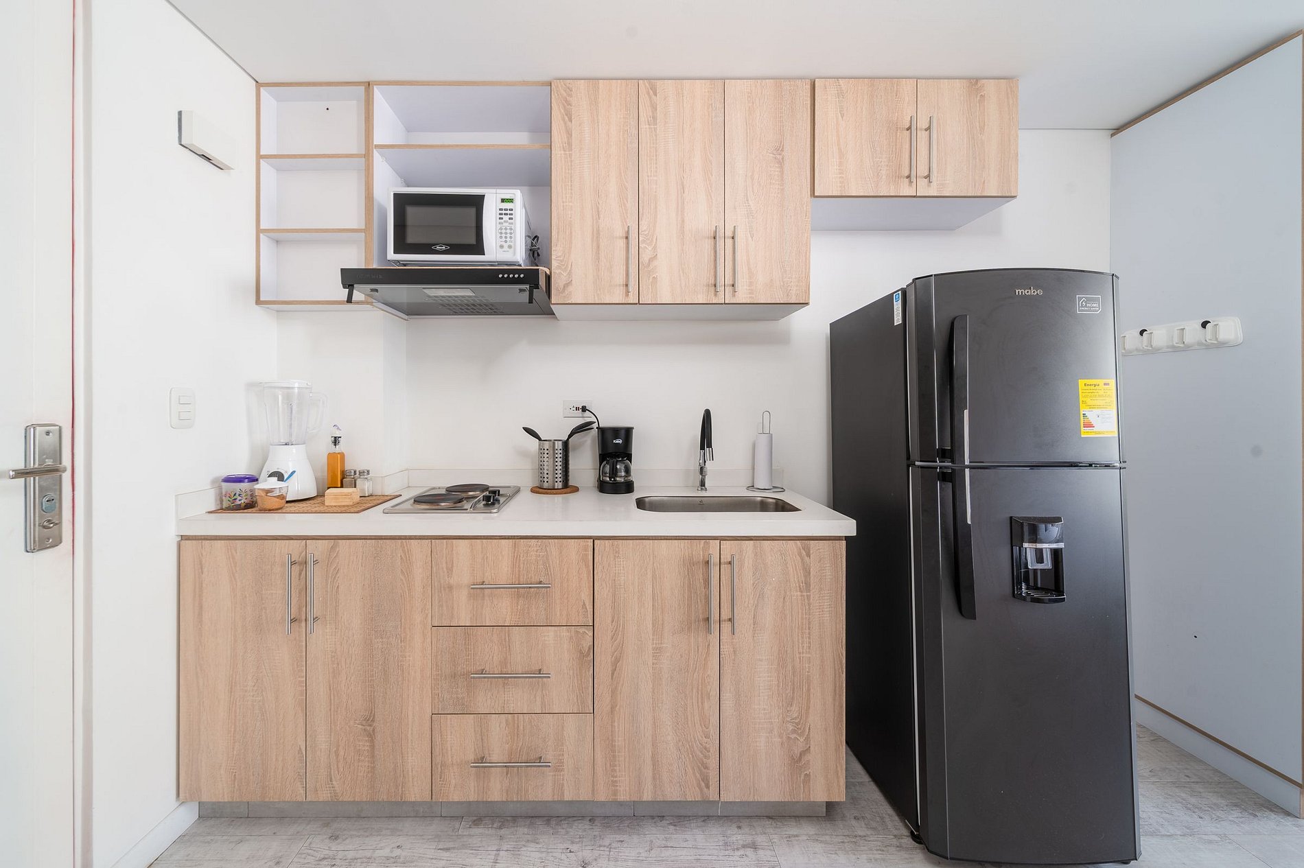 Este loft de 22 m² es perfecto para viajeros que buscan una estadía práctica, bien equipada y con excelente ubicación. La cocina pequeña está equipada con estufa eléctrica de dos puestos, nevera, microondas, cafetera, utensilios y loza para 2 personas, perfecta para preparar tus comidas durante la estadía. Todo ha sido pensado para que disfrutes de comodidad, funcionalidad y un diseño acogedor.