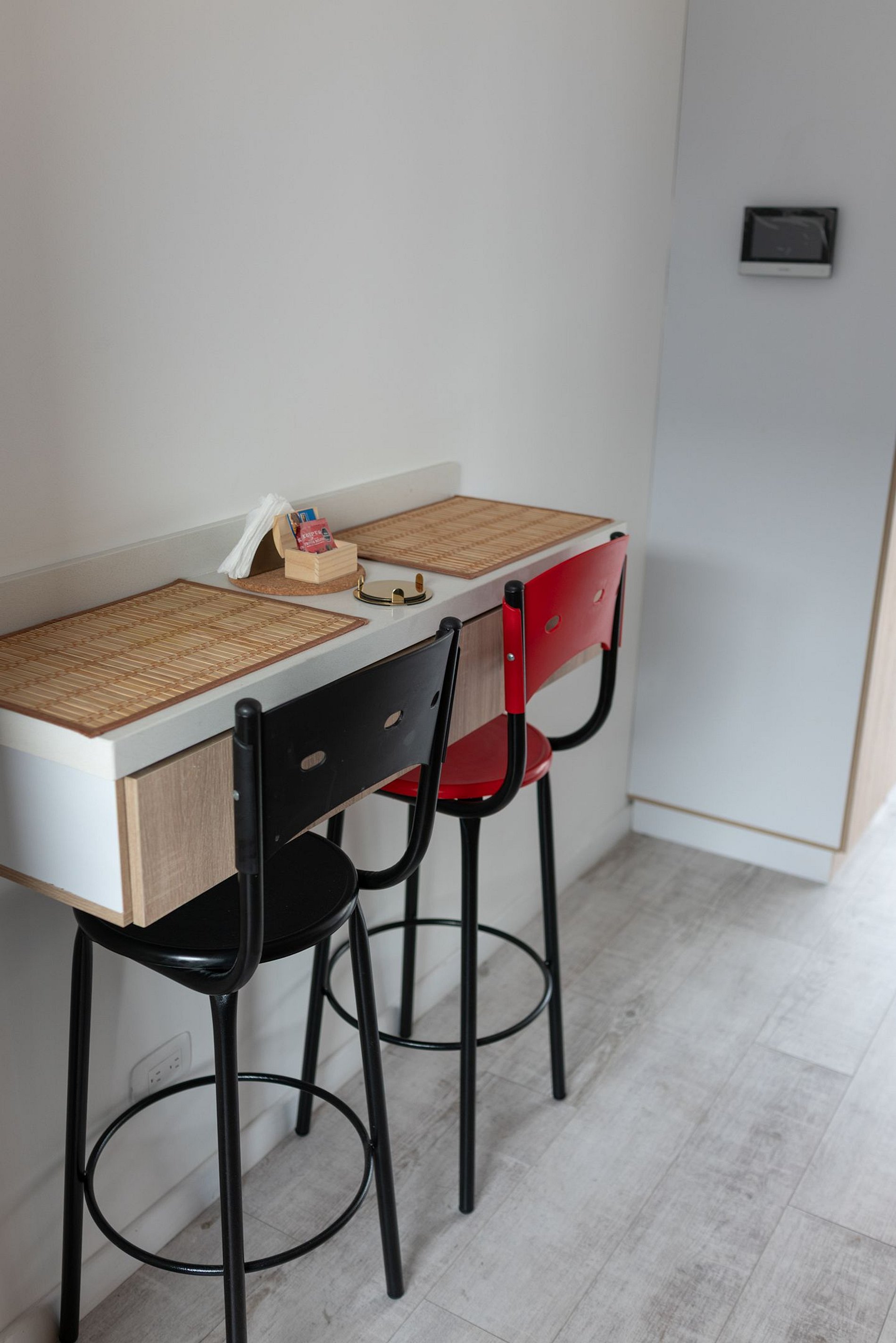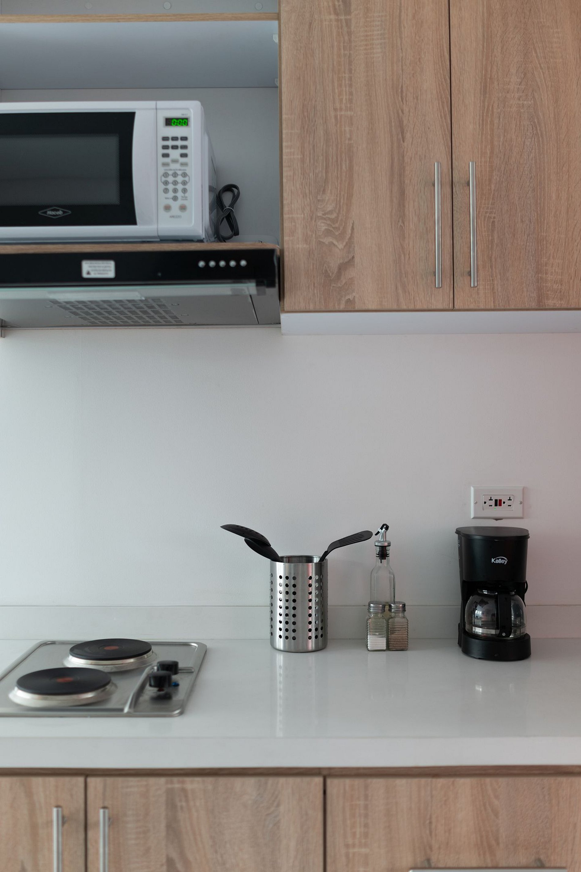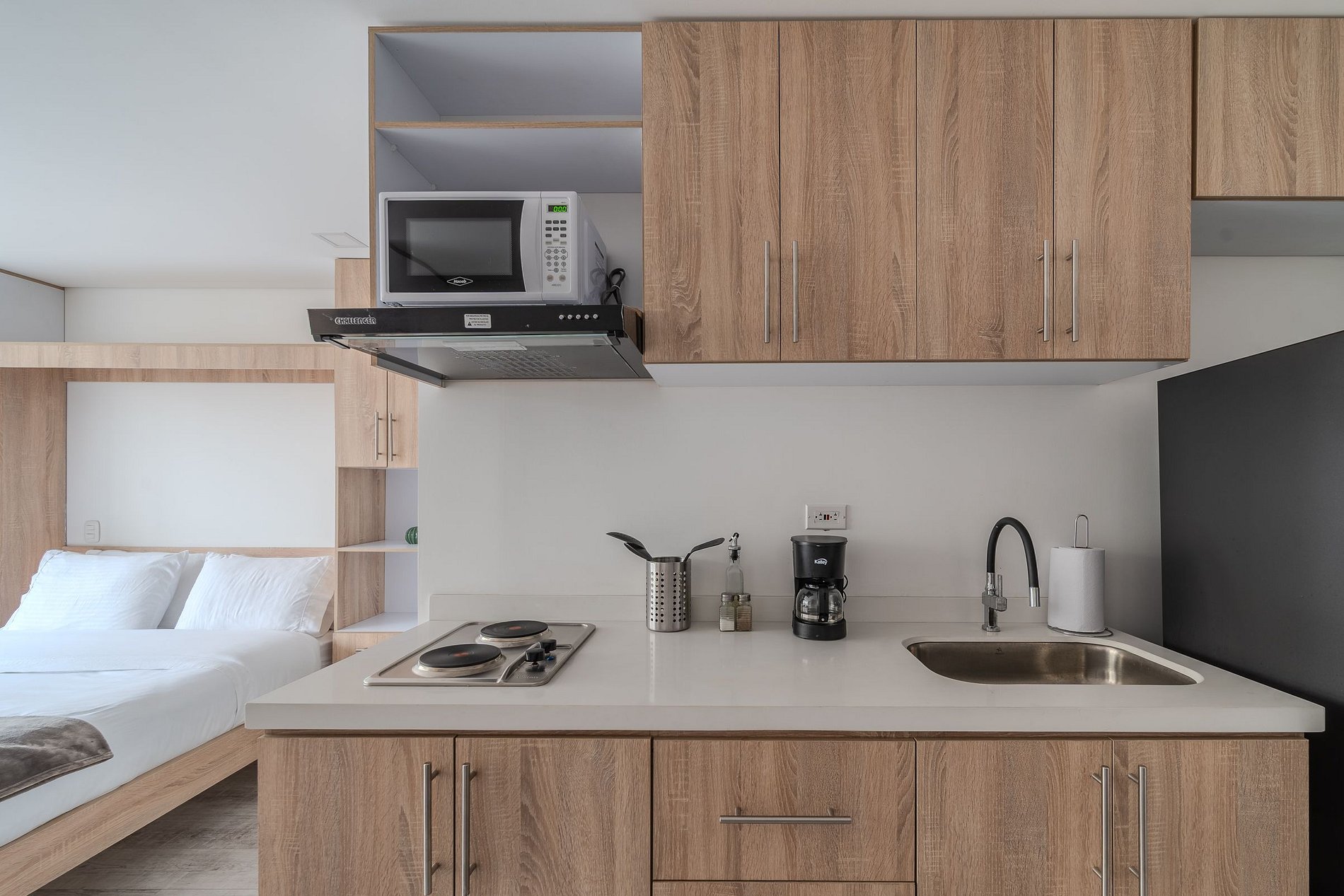 Este loft de 26 m² es perfecto para viajeros que buscan una estadía práctica, bien equipada y con excelente ubicación. La cocina pequeña está equipada con estufa eléctrica de dos puestos, nevera, microondas, cafetera, utensilios y loza para 2 personas, perfecta para preparar tus comidas durante la estadía. Todo ha sido pensado para que disfrutes de comodidad, funcionalidad y un diseño acogedor.