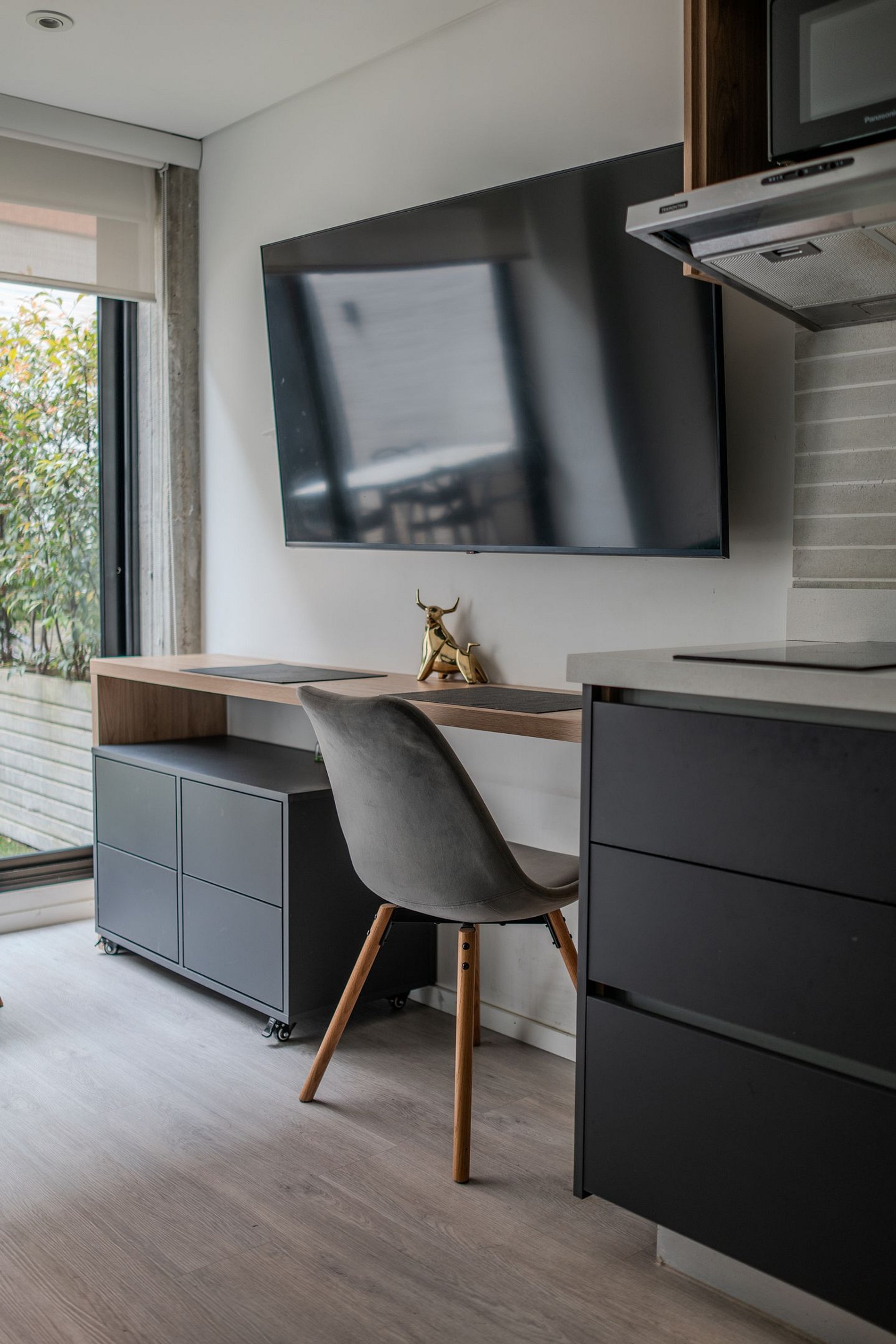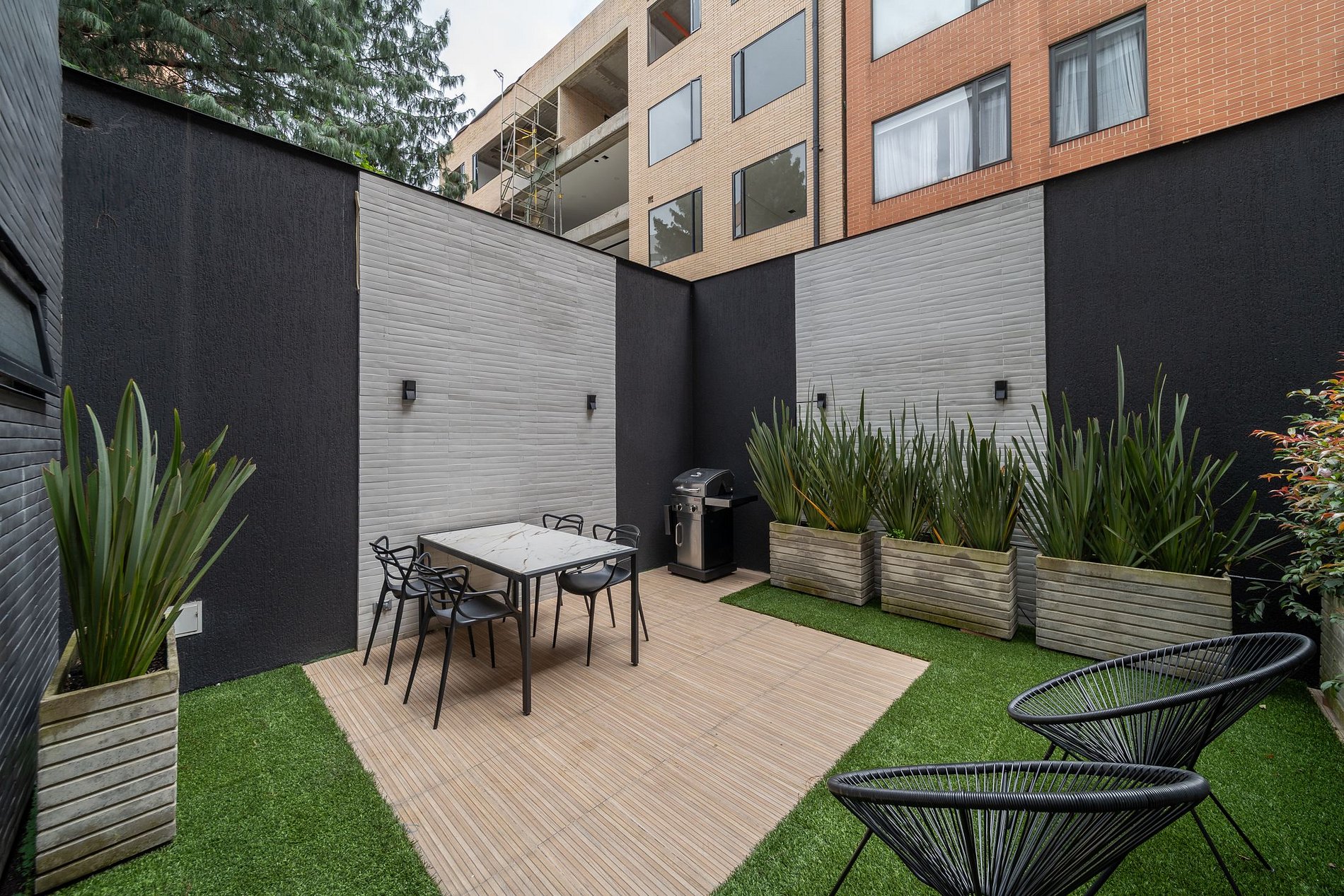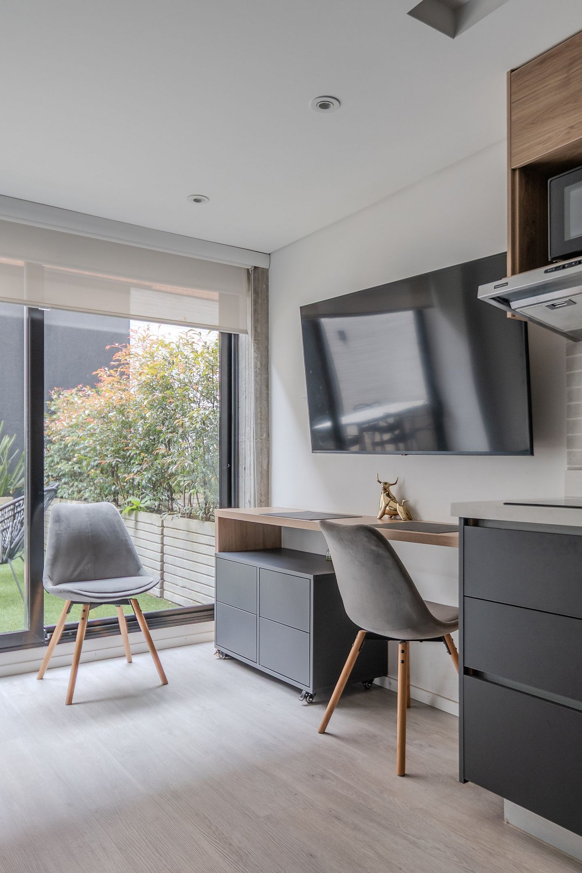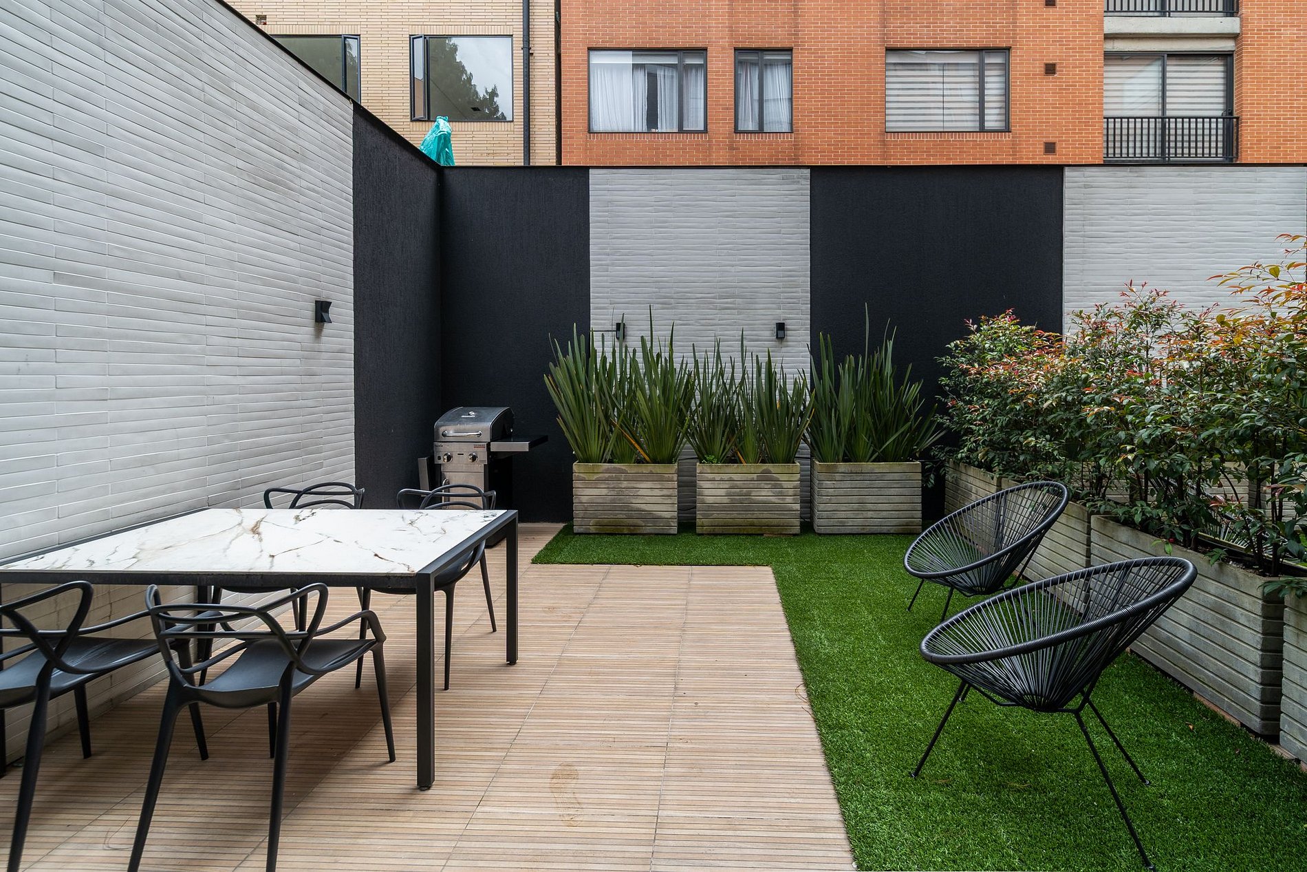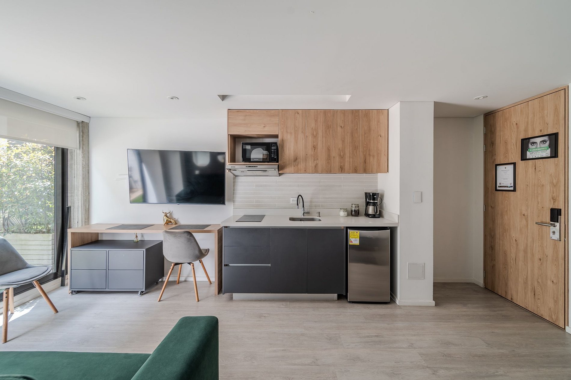 Con un diseño tipo loft y una distribución eficiente en 28 m², el espacio integra la habitación con una acogedora sala y un sofá cama semidoble. La cocina abierta cuenta con cafetera, horno microondas, vajilla y todo lo necesario para sentirte como en casa. Junto a la zona de descanso se encuentra un baño privado moderno y funcional. Uno de los mayores encantos de este apartamento es su terraza privada, un oasis verde en medio de la ciudad. Rodeada de vegetación y equipada con una mesa de comedor y sillas cómodas, es el lugar perfecto para disfrutar de un desayuno al aire libre. El edificio es privado y seguro, con cerraduras electrónicas y cámaras de vigilancia. Su ubicación en Chapinero te deja a pocos pasos del Estadio El Campín y el Movistar Arena, rodeado de cafeterías, restaurantes, tiendas y excelentes opciones de transporte. Ideal para quienes buscan comodidad, estilo y una conexión auténtica con la ciudad.