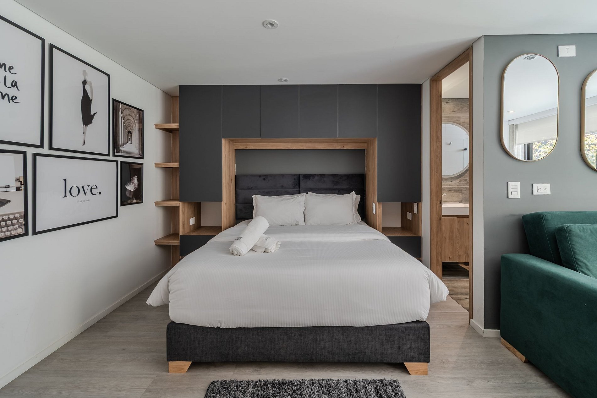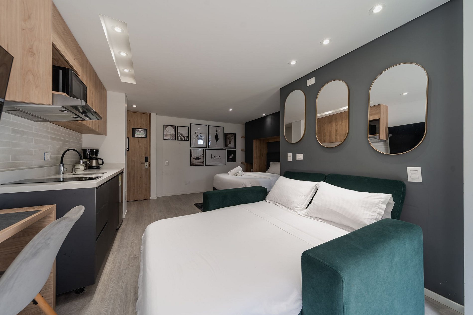 Su diseño contemporáneo combina funcionalidad y estética, con apartamentos bien distribuidos, zonas comunes limpias y acceso a lavandería de autoservicio (con costo adicional por uso de máquina), ideal para quienes planean estancias medias o largas. La ubicación es uno de sus mayores atractivos: a pocos pasos del Estadio El Campín y del Movistar Arena, cerca de universidades, oficinas, cafés, restaurantes y principales vías de transporte.