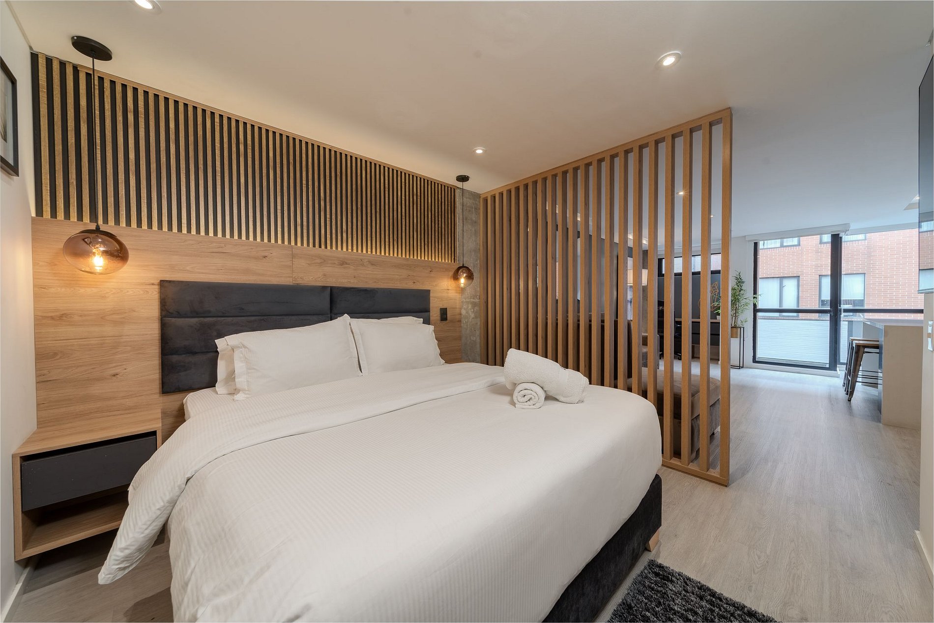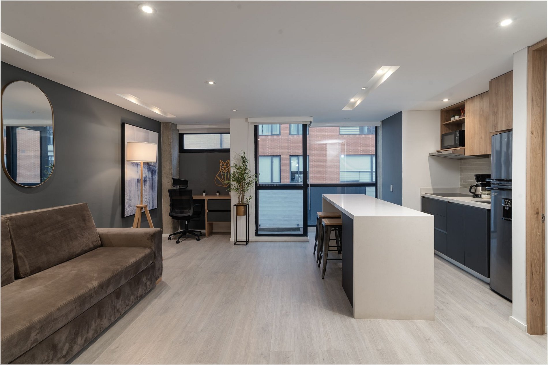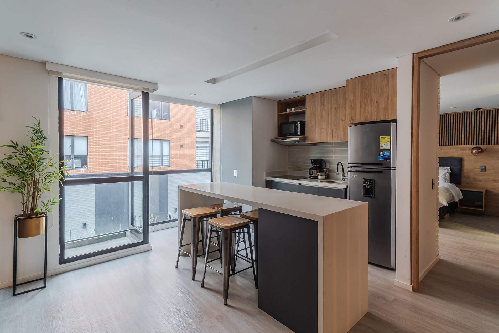 Su diseño contemporáneo combina funcionalidad y estética, con apartamentos bien distribuidos, zonas comunes limpias y acceso a lavandería de autoservicio (con costo adicional por uso de máquina), ideal para quienes planean estancias medias o largas. La ubicación es uno de sus mayores atractivos: a pocos pasos del Estadio El Campín y del Movistar Arena, cerca de universidades, oficinas, cafés, restaurantes y principales vías de transporte.