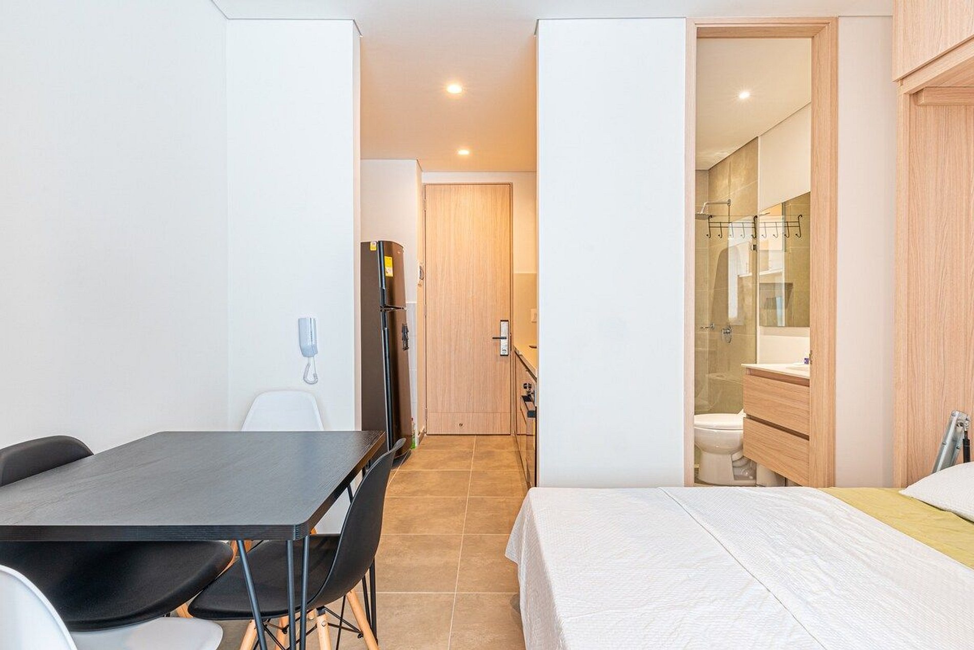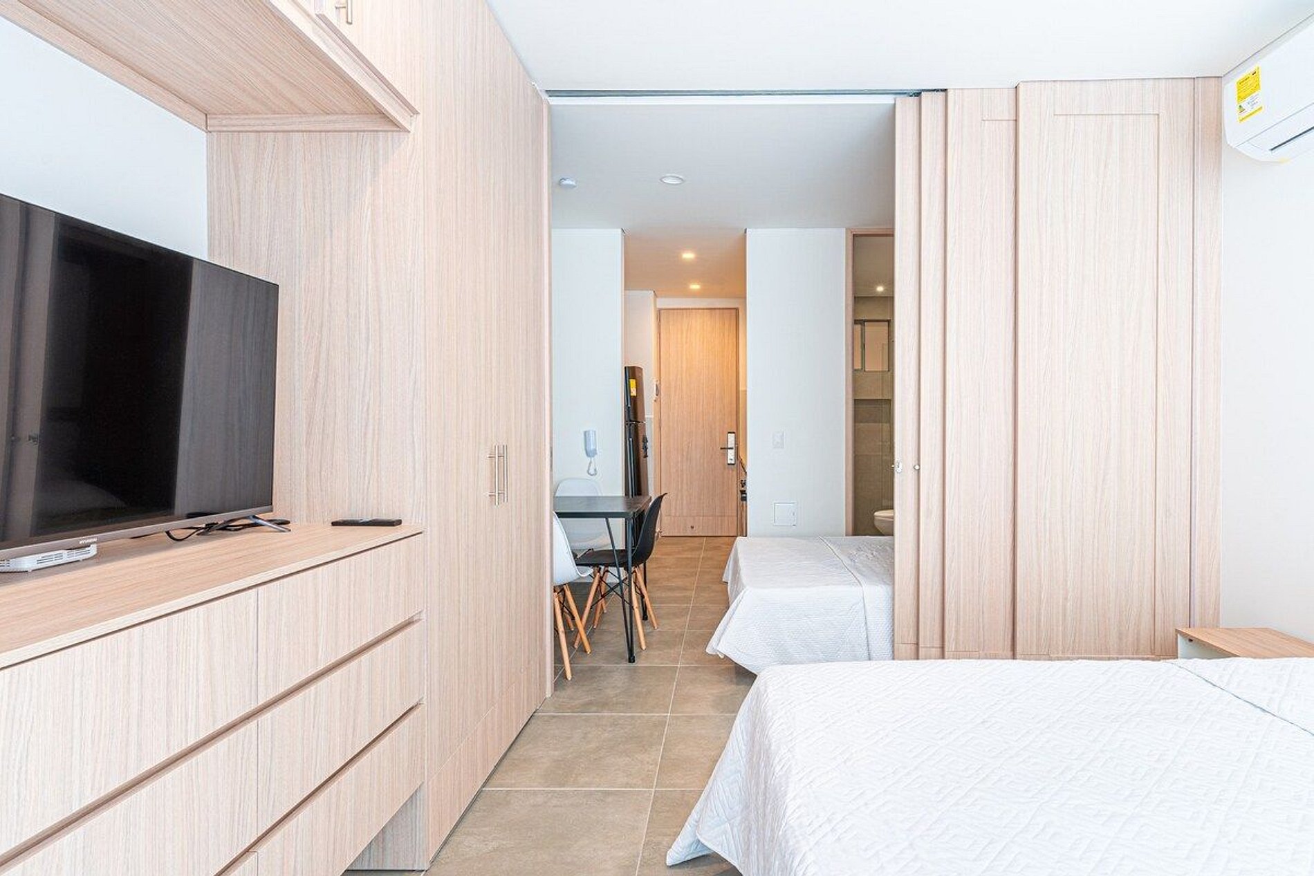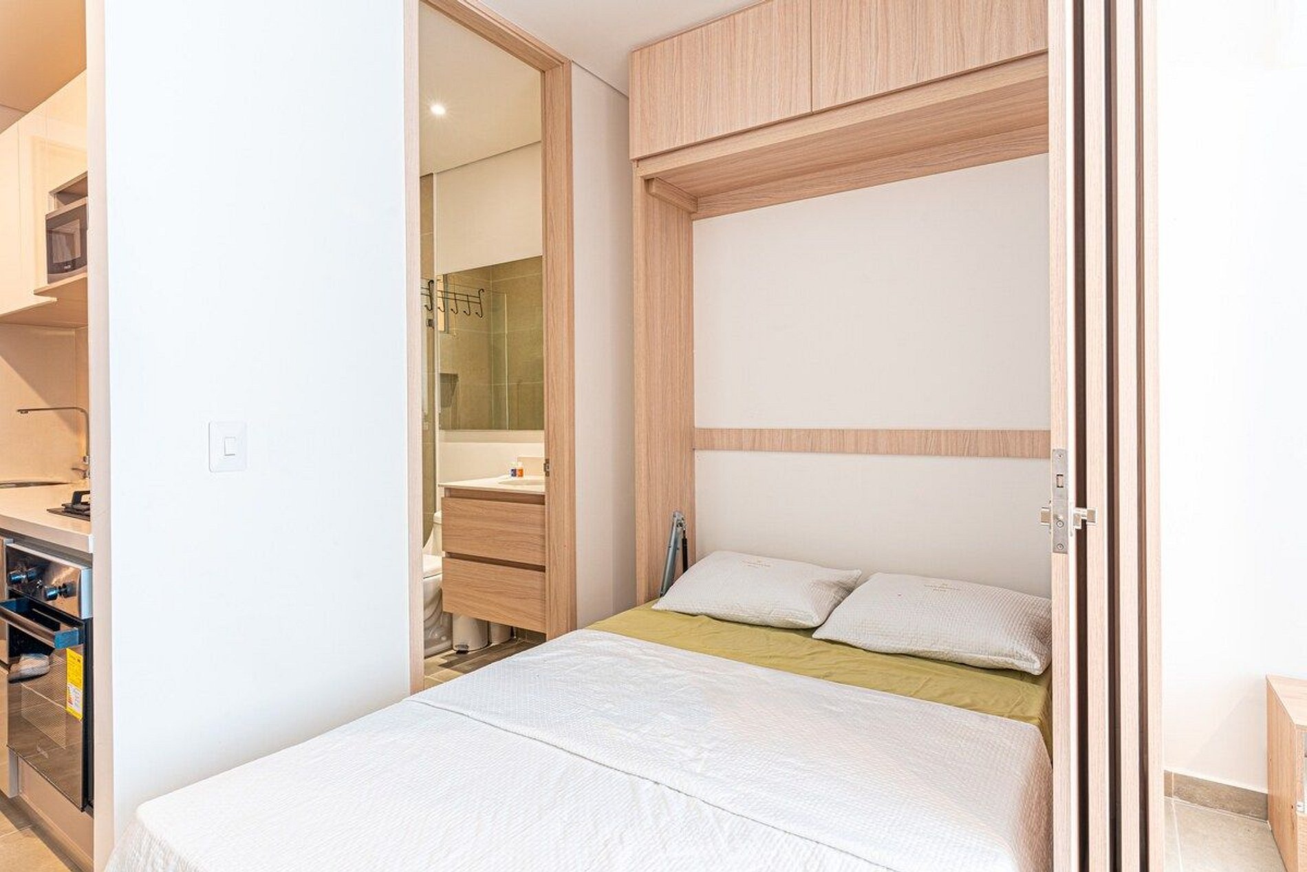 El apartamento de 30mts2, cuenta con una habitación principal con una cómoda cama doble y un baño privado, garantizando privacidad y confort. La sala incluye una habitación auxiliar con una cama abatible tipo doble, perfecta para acomodar a más huéspedes. La cocina está completamente equipada con una estufa de cuatro puestos, horno, amplio mesón de trabajo y lavaplatos, junto con el mobiliario necesario y un espacio para el refrigerador, permitiéndote preparar tus comidas favoritas.