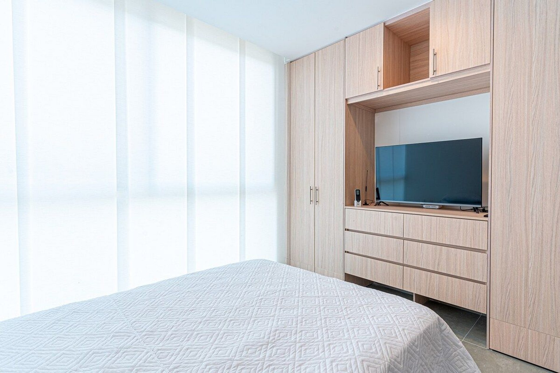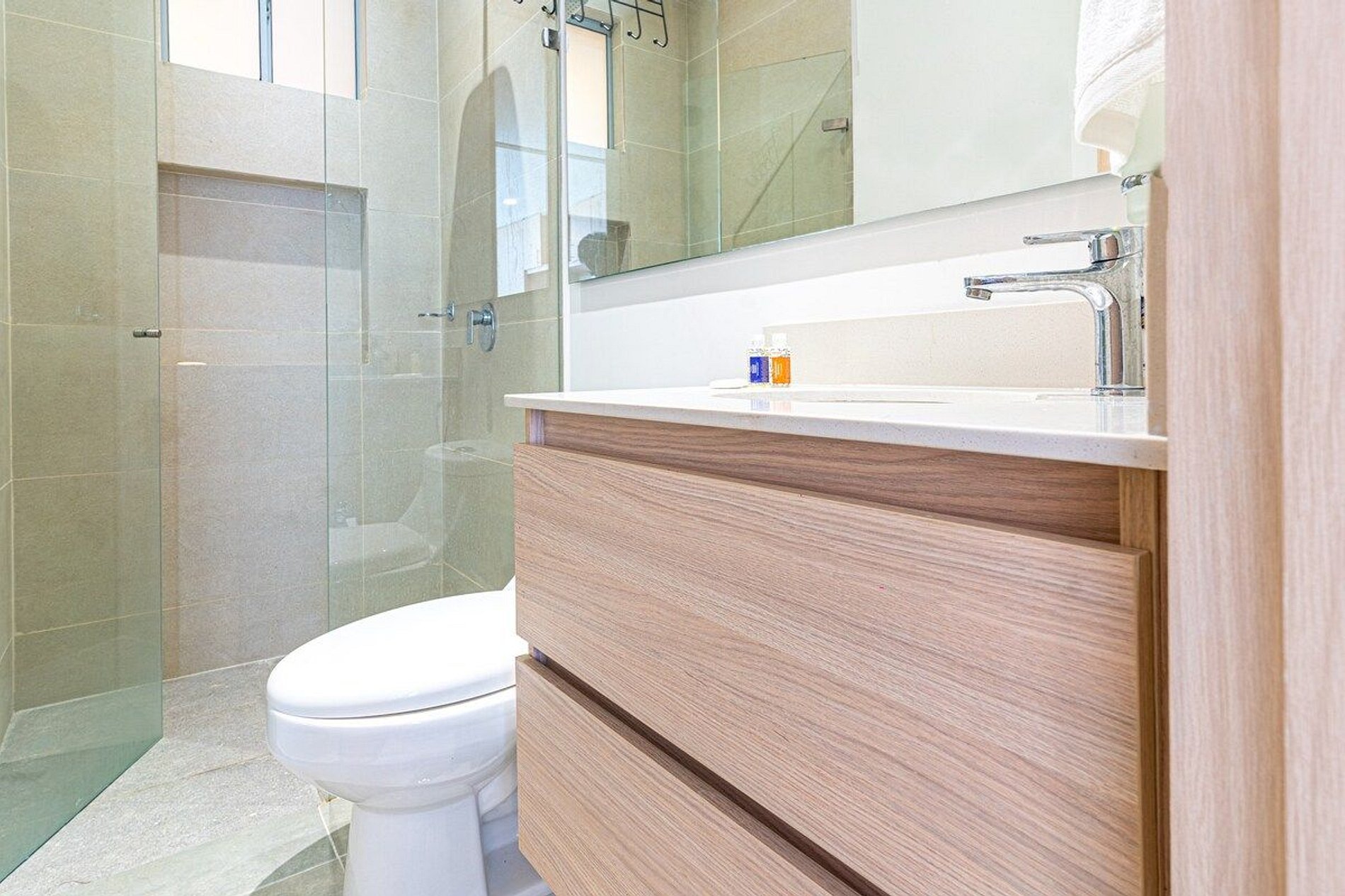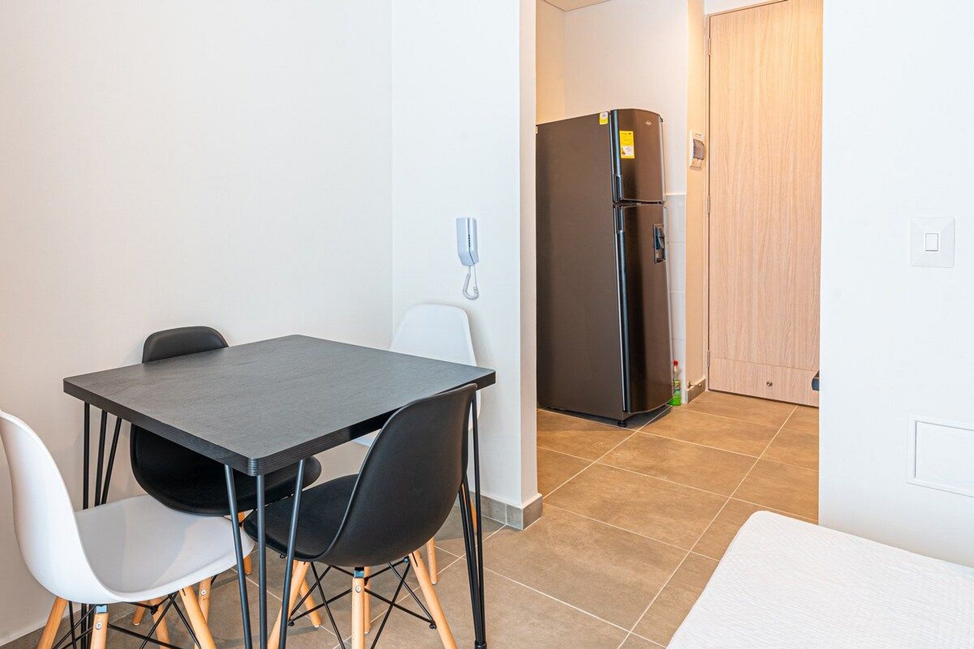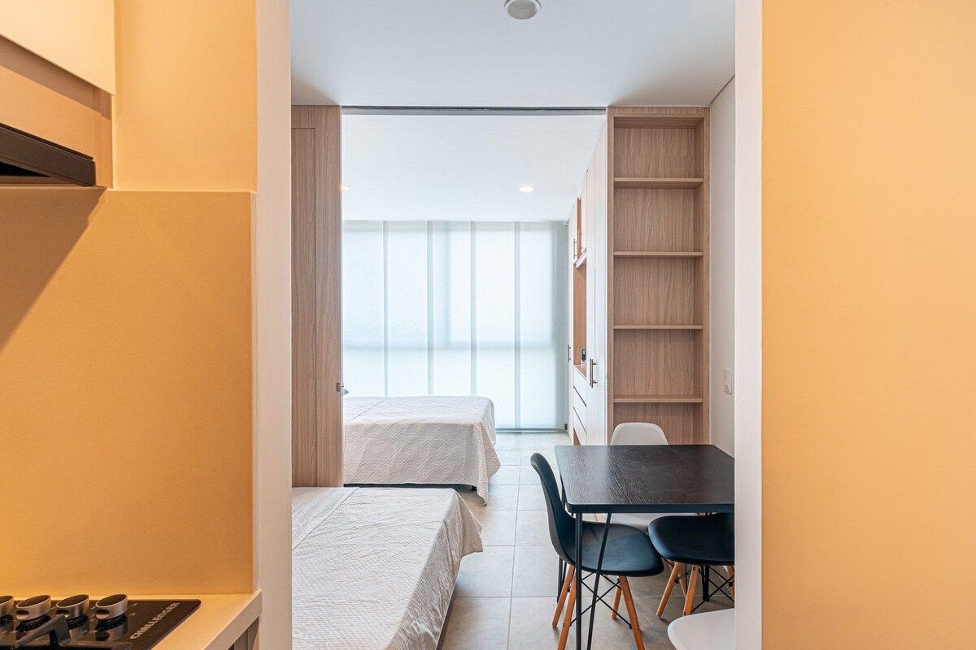 El apartamento de 30mts2, cuenta con una habitación principal con una cómoda cama doble y un baño privado, garantizando privacidad y confort. La sala incluye una habitación auxiliar con una cama abatible tipo doble, perfecta para acomodar a más huéspedes. La cocina está completamente equipada con una estufa de cuatro puestos, horno, amplio mesón de trabajo y lavaplatos, junto con el mobiliario necesario y un espacio para el refrigerador, permitiéndote preparar tus comidas favoritas.